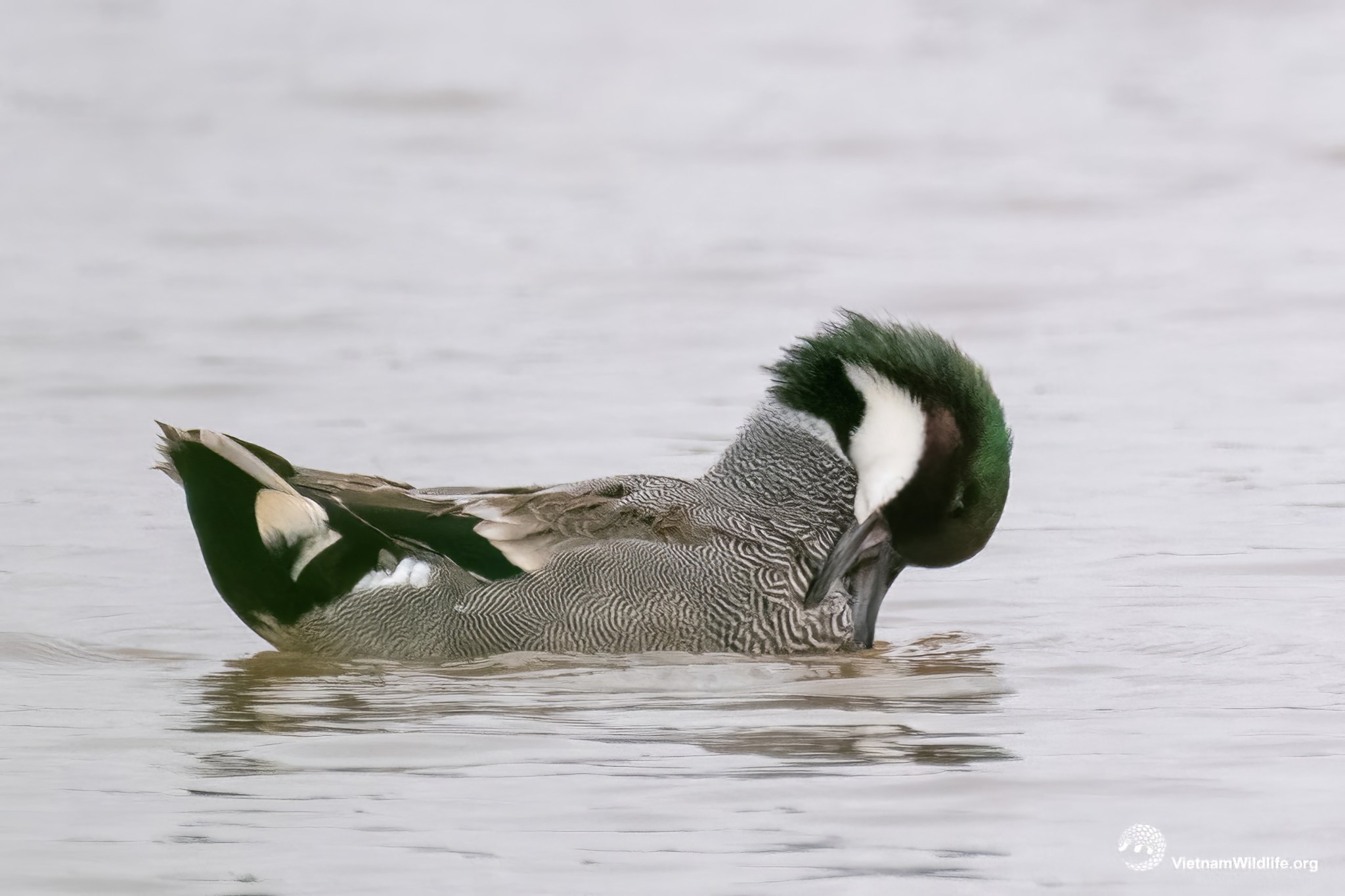 Falcated duck is a medium sized species in the duck group (about 50 cm). The male has distinctive dark glossy green head, white throat and upper foreneck separated by black thin band, and mostly greyish remainders. The female is different from the male with plain greyish-brown head.