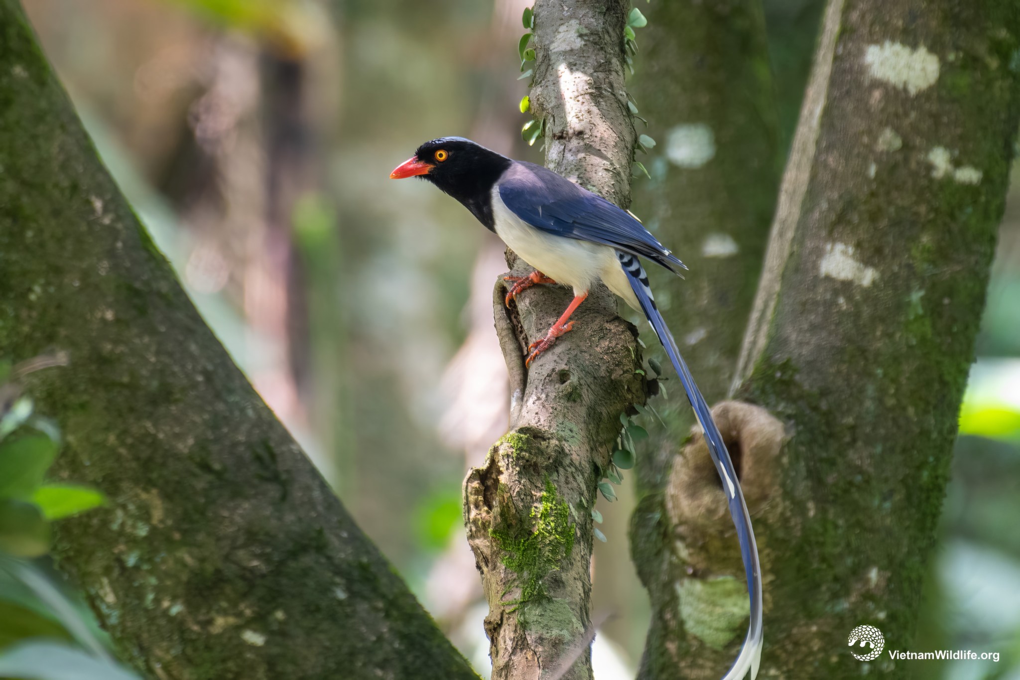 The red-billed blue magpie is a medium sized species of bird (about 65cm) with longest tail in the crow family . The head, neck and breast are black with a whitish spotting on the crown. The shoulders and rump are a duller blue and the underparts are a greyish cream. The wing and tail are brighter blue but there are broad white tip in under-tail. The bill, feet and legs are distinctively bright orange-red.
