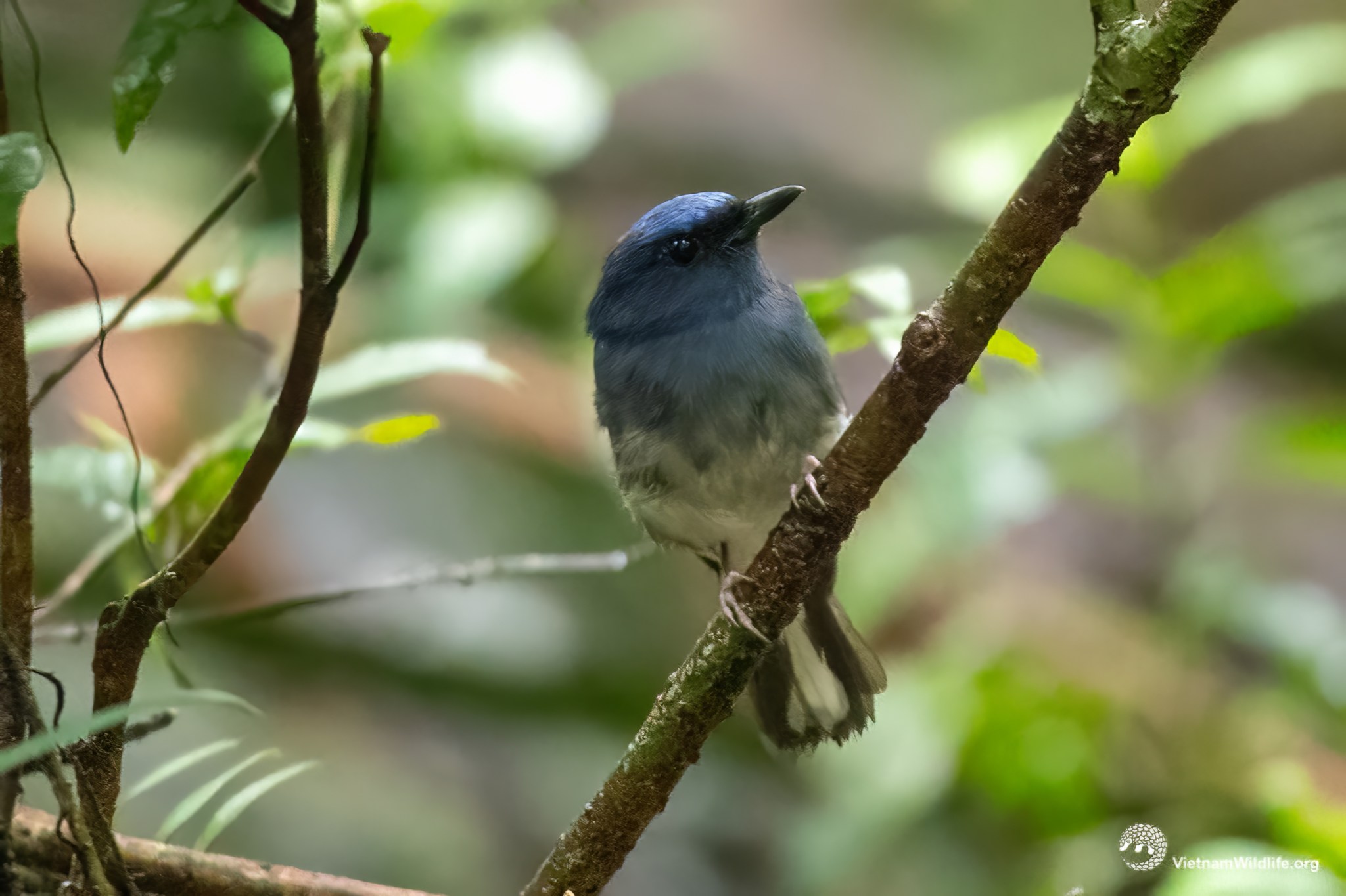 White tailed flycatcher is relatively large bird (18 cm) in flycatcher family. Male and female are very different except white lines on outertail. Male has a blue head and body, white belly and vent while female has brown upperparts and white crescent on upper breast.