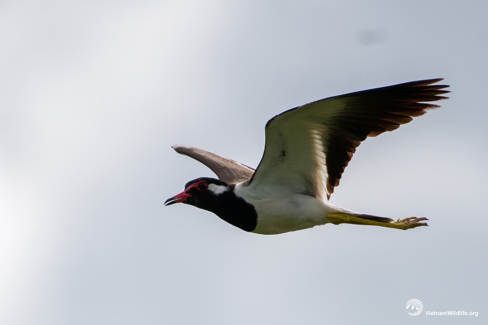 Red-wattled lapwings are large species in wader group (about 35 cm). It has black head with distinctive white patch at ear-covert and a black-tipped red bill, light brown back and wing, white underparts and very long yellow legs. Both sexes are similar.