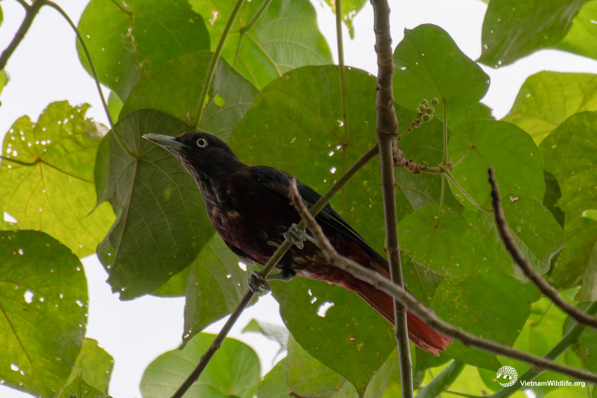 Maroon Oriole is medium sized species in Oriole group (about 27 cm). Male has black head to upper breast with white eye, dark maroon body, duller maroon tail, black wing. Female has duller plumage and whitish underparts with heavy dark streaks.