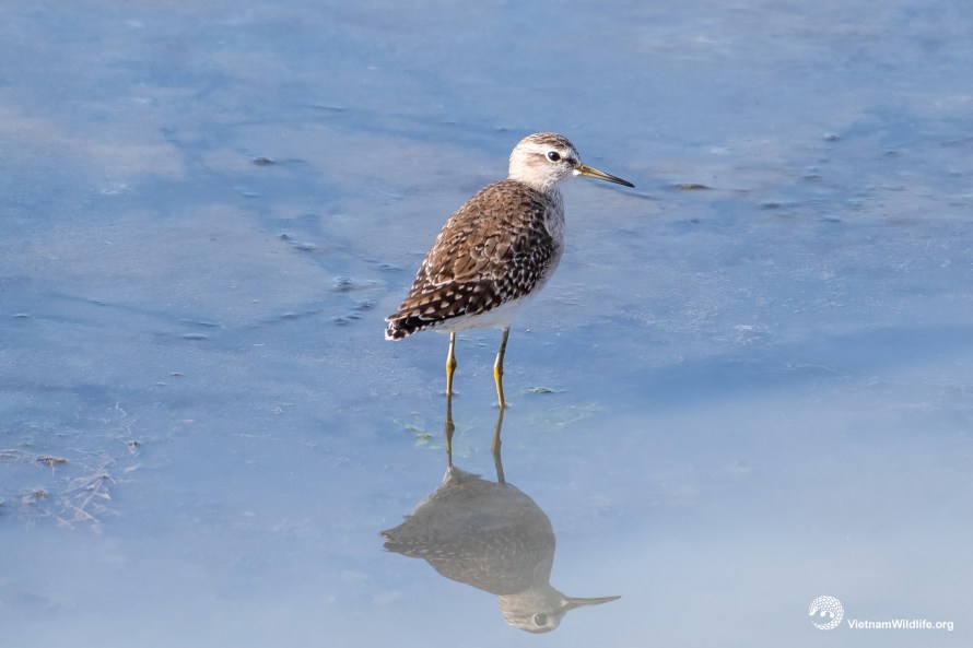 Wood sandpiper is small to medium sized species in sandpiper group (about 20 cm). It has long greenish straight bill, long white supercilium, olive-brown and pale-speckled upperparts, white underparts and pale greenish-yellowish legs and feet.