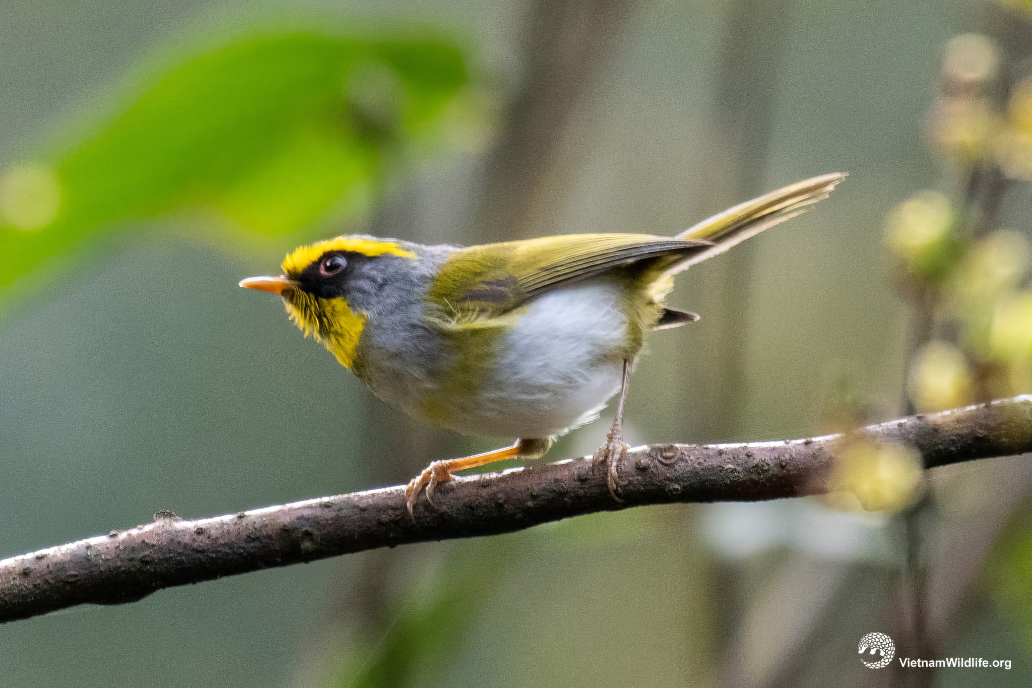Black-faced warbler is small warbler (about 10 cm). It has prominent yellow supercilium and throat, blackish mask, pale grey crown, nape and upper breast-sides, whitish lower breast and belly, and yellow undertail-coverts. Male and female are similar.