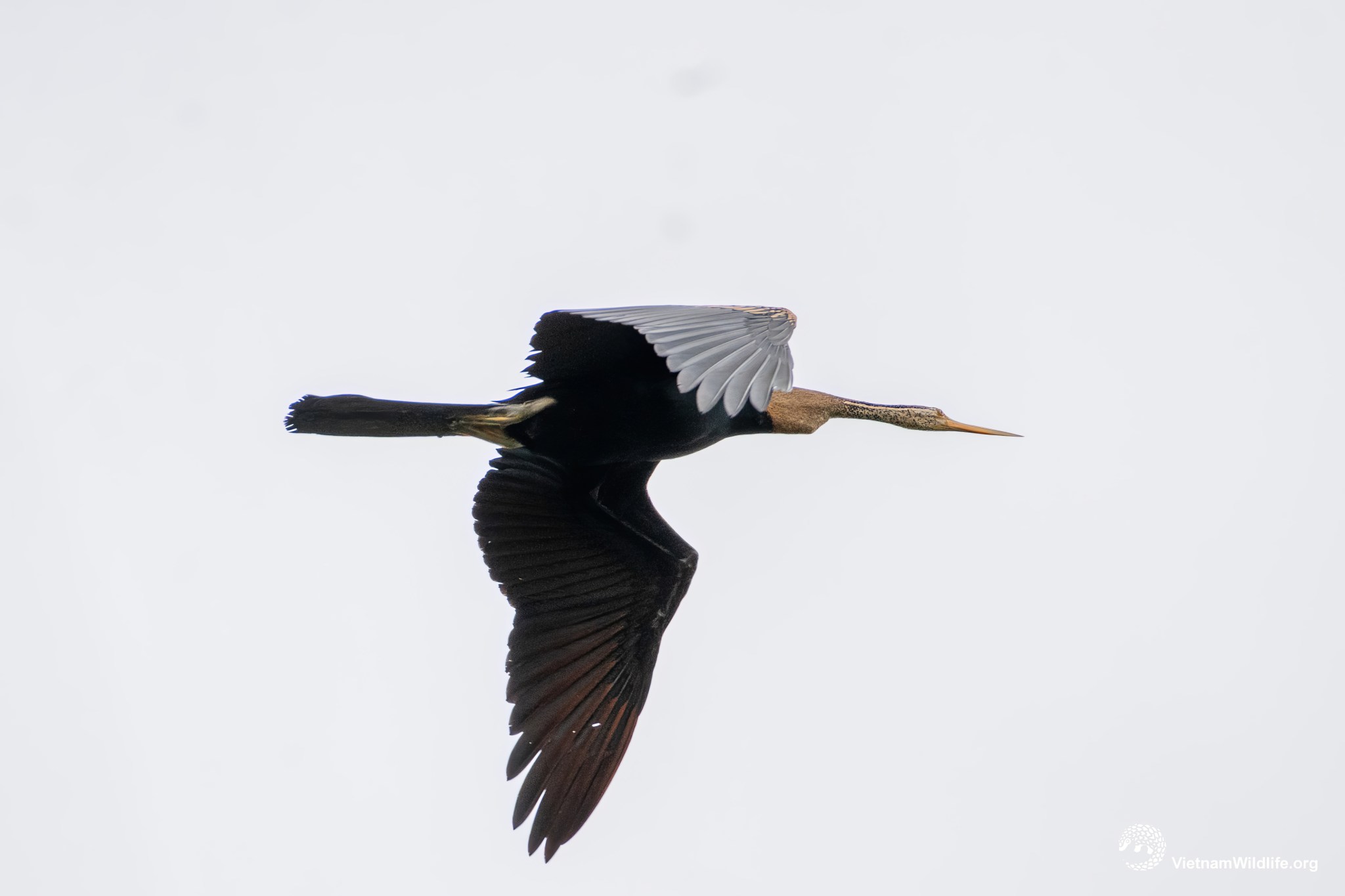 Oriental darter is large water bird (about 90 cm). It has distinctive long pointed bill, dark brown head and long thin neck, pale throat with long white stripes from eye down sides of neck, and relatively long tail.