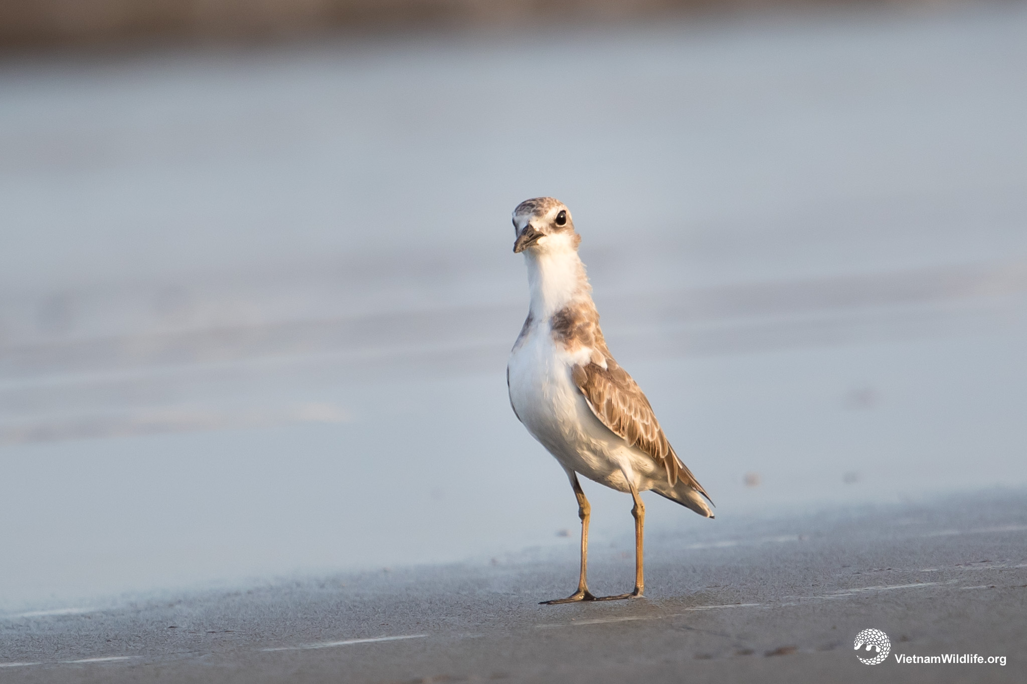 Greater sand-plover is large sized species in sand-plover group (about 24 cm). In non breeding season, it has a broad and white supper-cilium, long and thick black bill, white forehead, greyish-brown upperparts and white underparts and yellowish feets and legs.