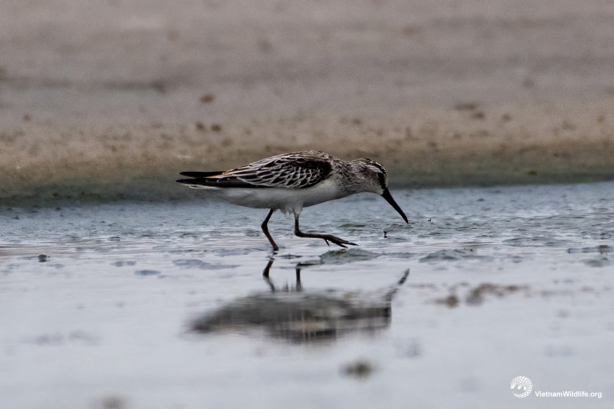 Broad billed sandpiper is a medium sized species in sandpiper group (about 17 cm). It has long black bill and noticeably kinked downwards at tip. In non-breeding season, it has short white supercilium, grey head and upperparts with dark streaks and whitish underparts. Male and female are similar.