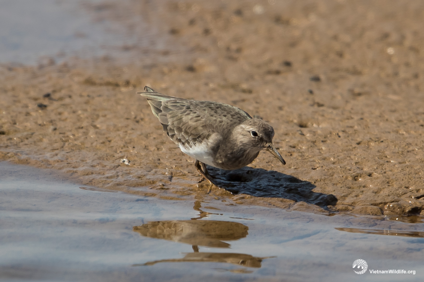 Temminck’s stint is small sized species in sandpiper group (about 15 cm). It has relatively long and thick bill. In non-breeding season, it has greyish-brown upperparts, white underparts and greenish-yellow legs and feet. In breeding season, it has more dull olive-brown upperparts ,and washed brown sides of head and breast.
