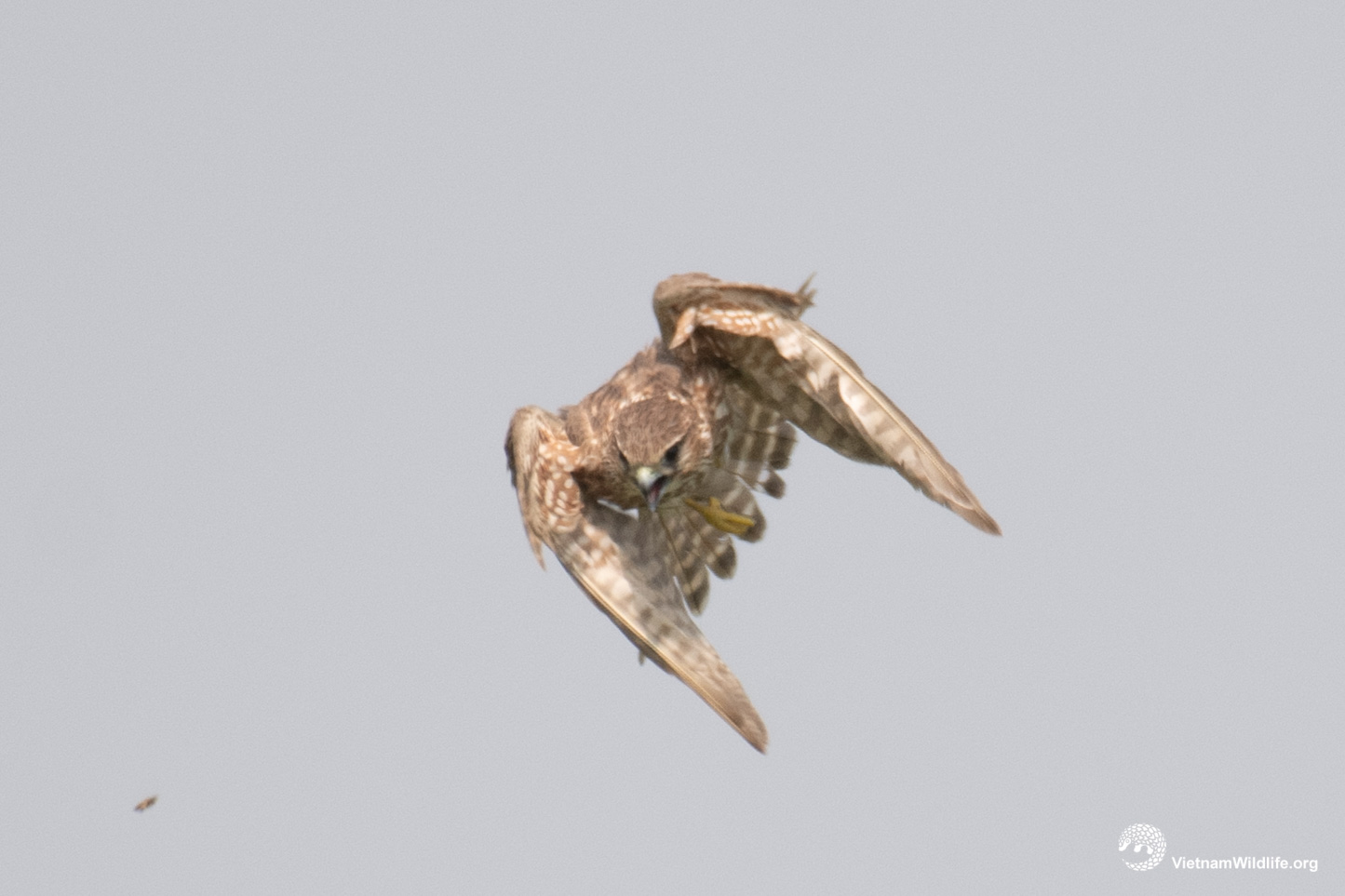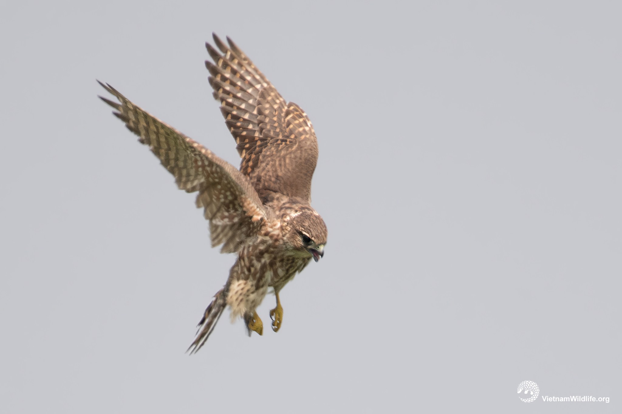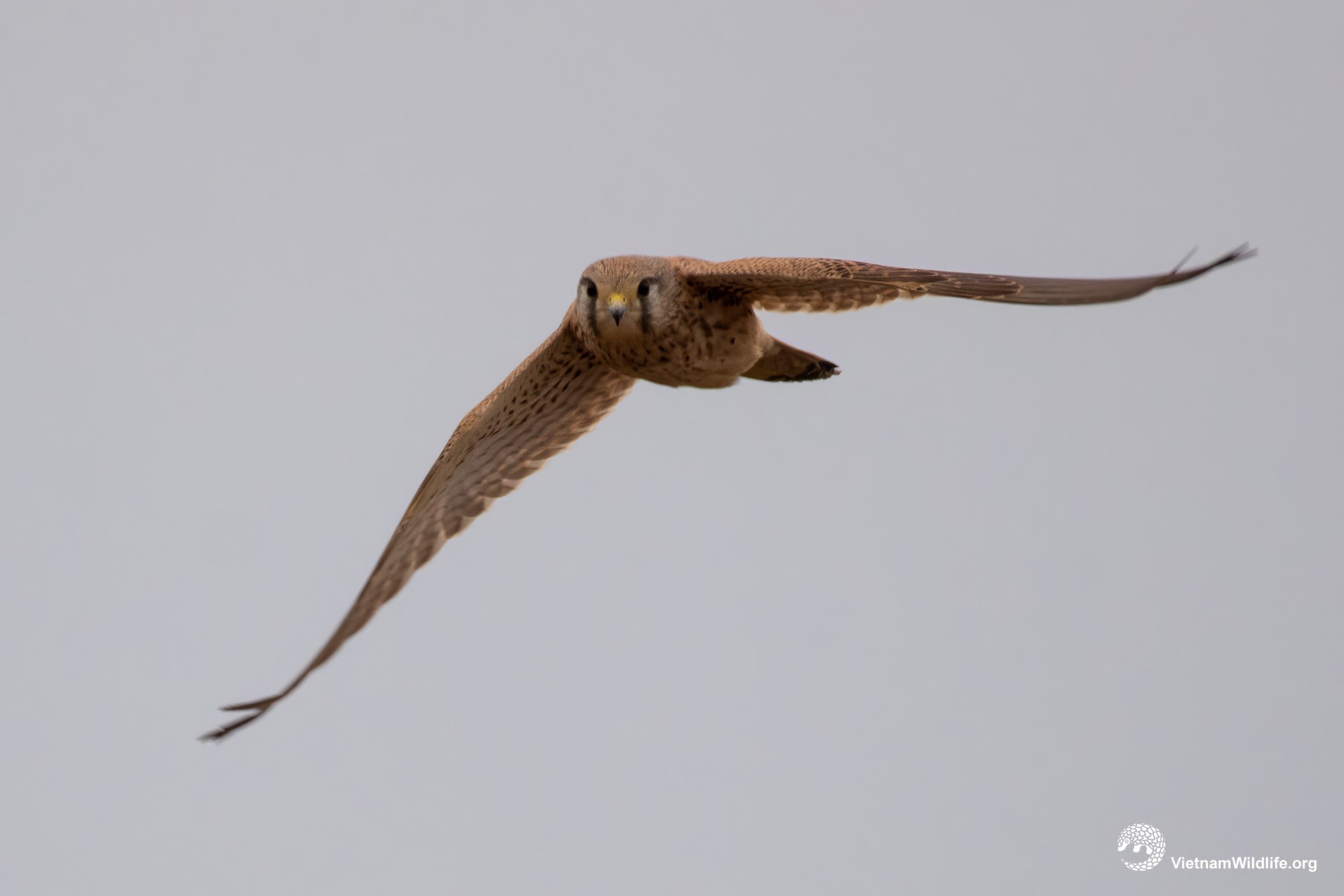 Common kestrel is a large sized species in falcon group (about 30 cm). The male has greyish head dark line behind eye, grey rump and uppertail, rufous upperparts and pale buffish underparts with dark streaks. In flight, underwing appears largely whitish with dark markings. Female has warm brown head, rump and uppertail.