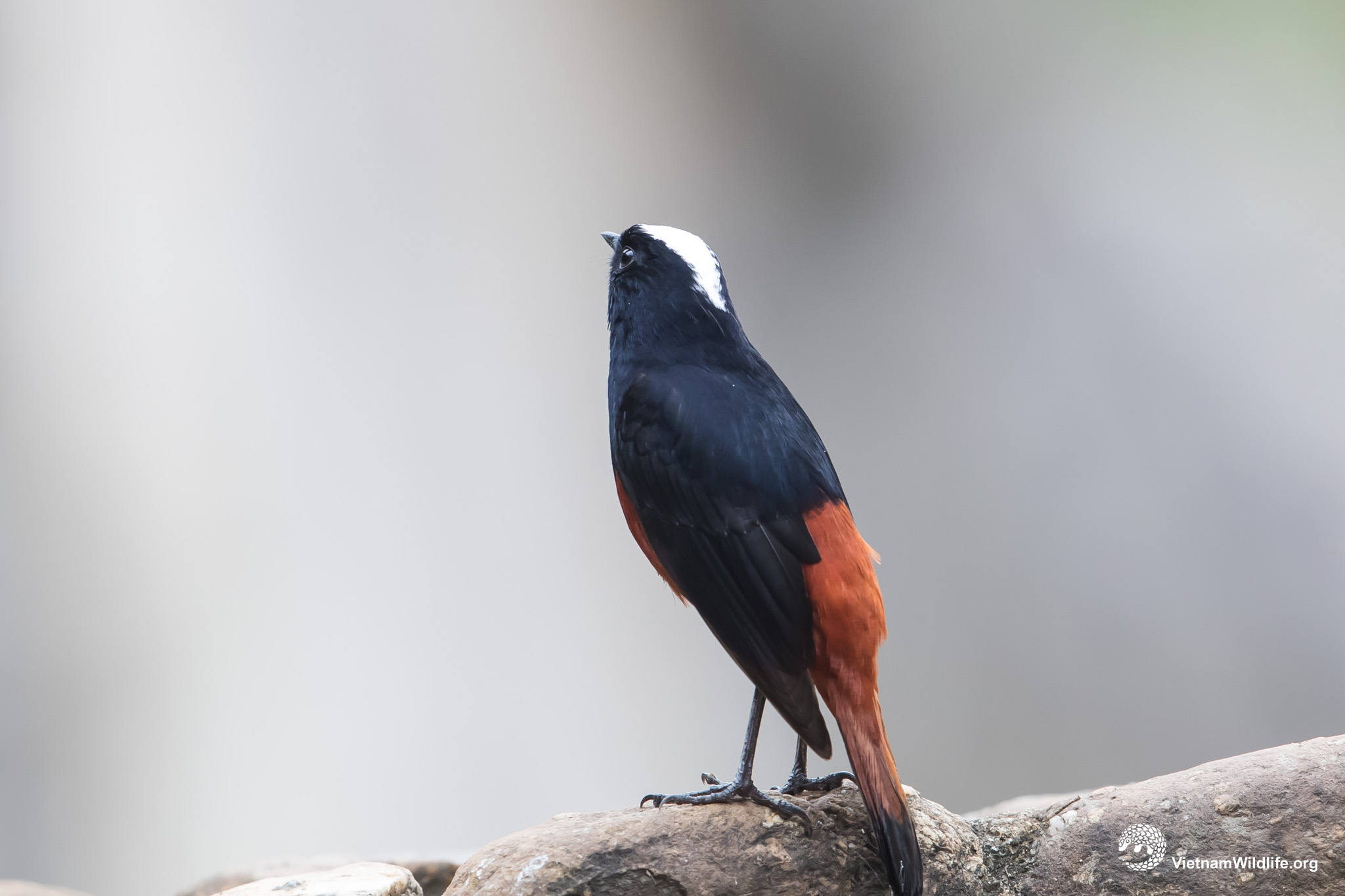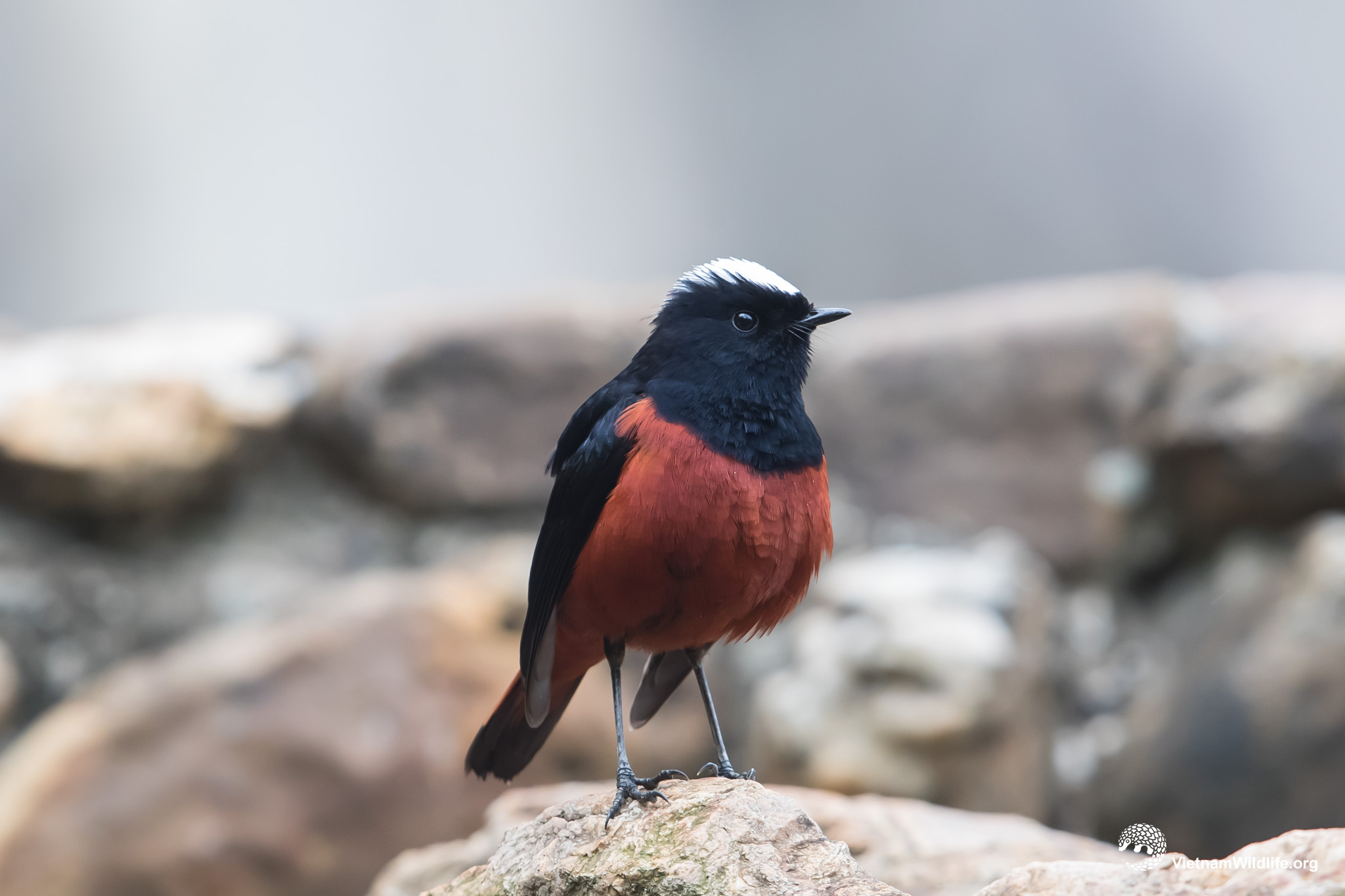 White-capped water redstart is large sized species in redstart group (about 20 cm). It has unmistakable plumage with contrasting white cap, black head, wing and glossy back, and bright chestnut lower breast, rump and underparts. Male and female are similar.