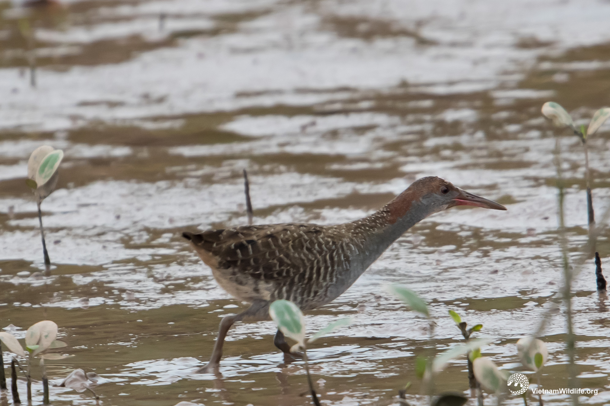 Slaty-breasted rail is medium sized species in rail group (about 28) cm. It has long, reddish-pink bill, chestnut crown and nape, grey head sides and breast, olive-brown upperparts with heavy white motting/baring, grey underparts with larger white bar along franks. Male and female are similar.