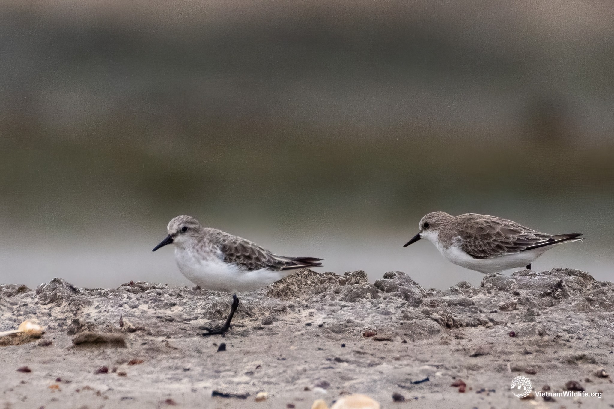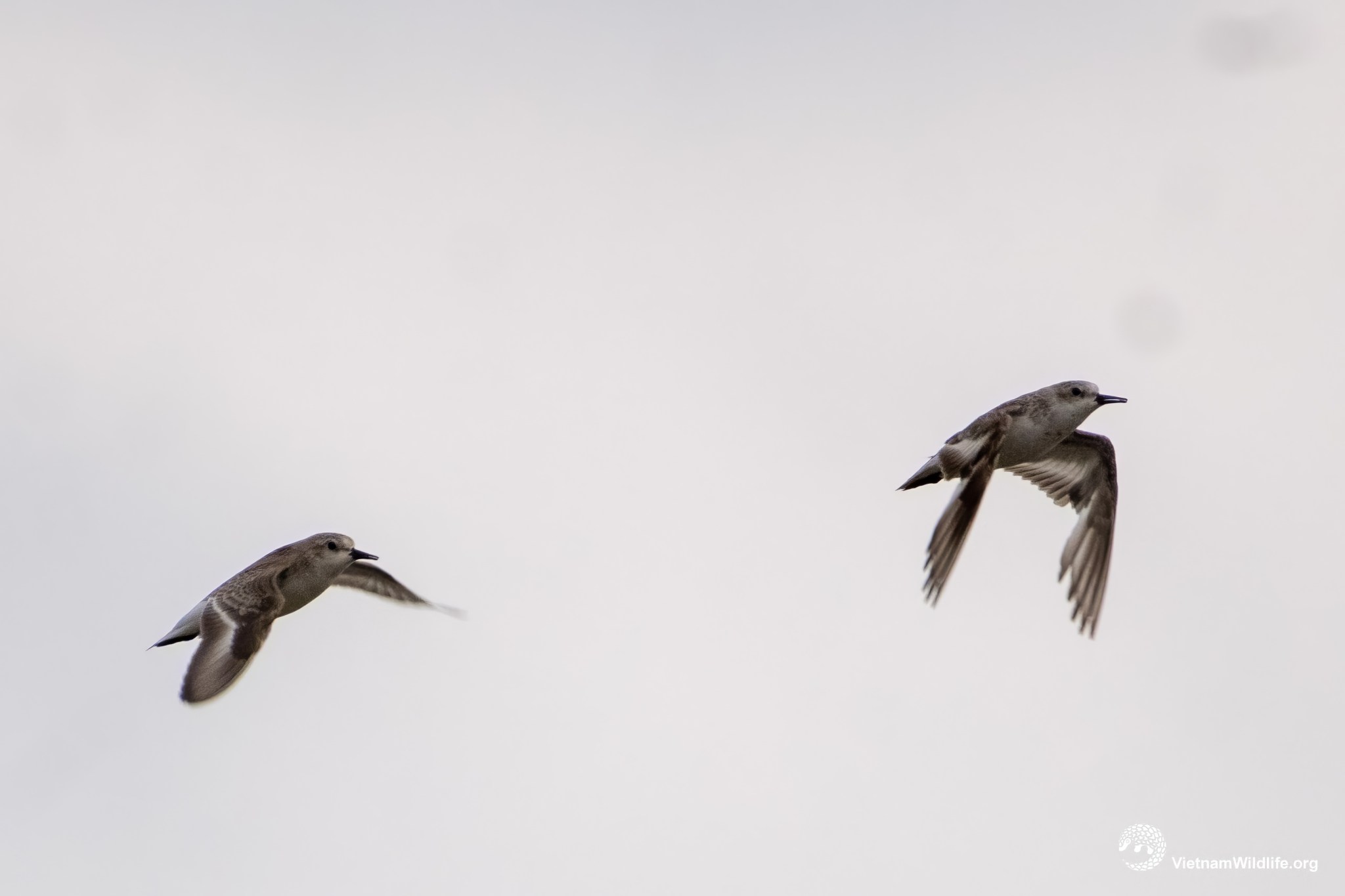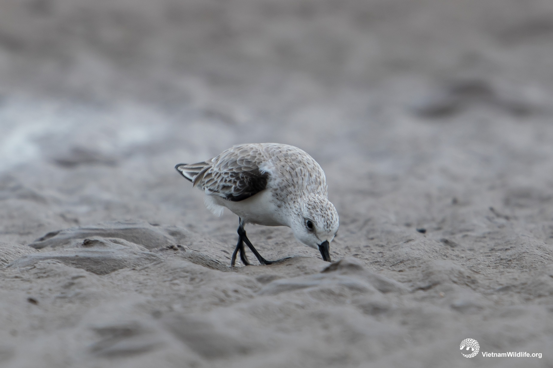 Sanderling is the relatively large sized species in small sandpiper group (about 19 cm). In non-breeding season, it has a pale grey upperparts with black wing patches and uppertail, plain white underparts. Male and female are similar.