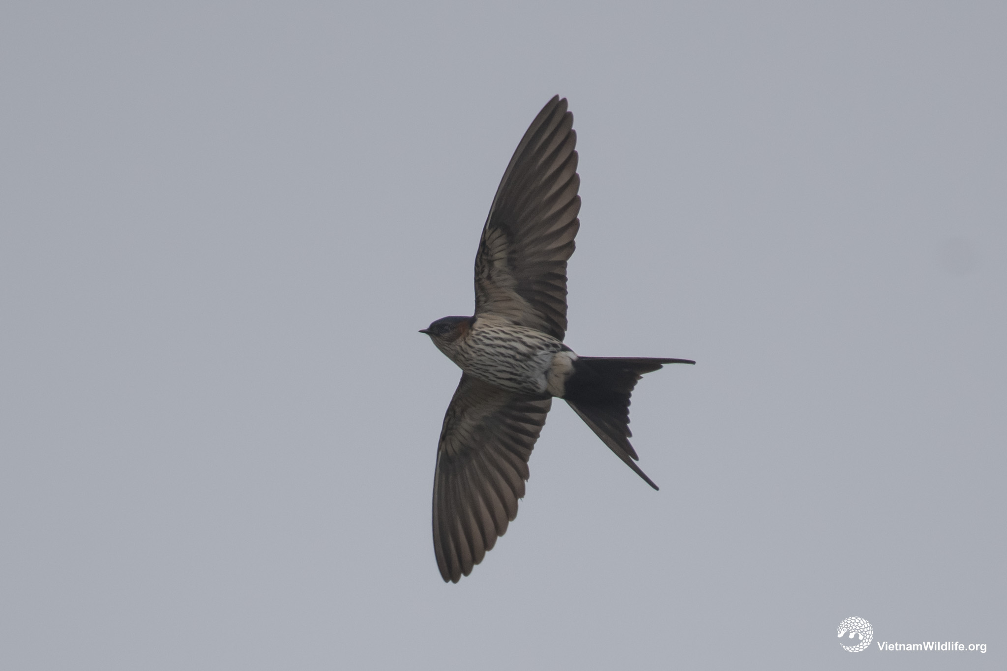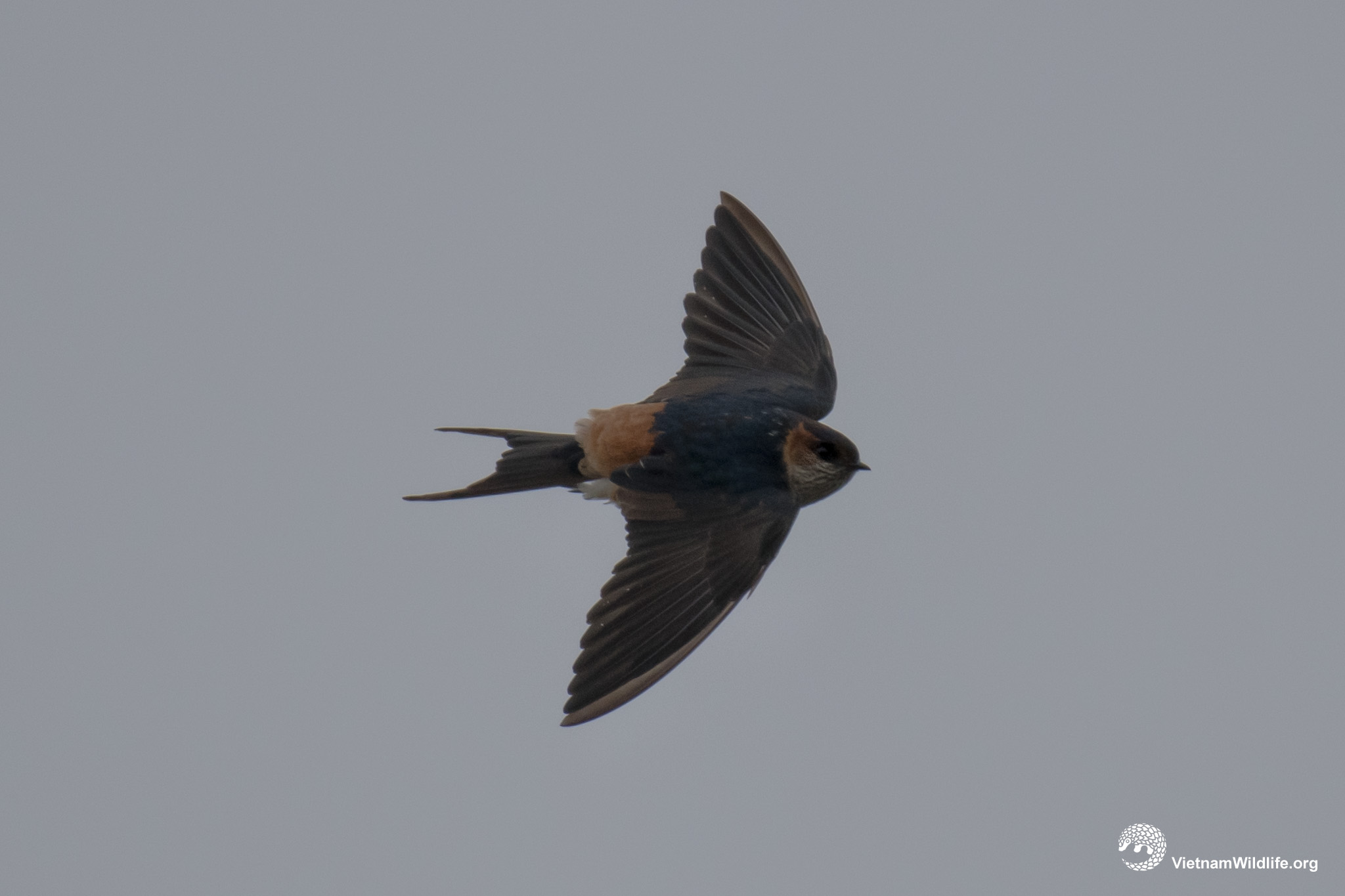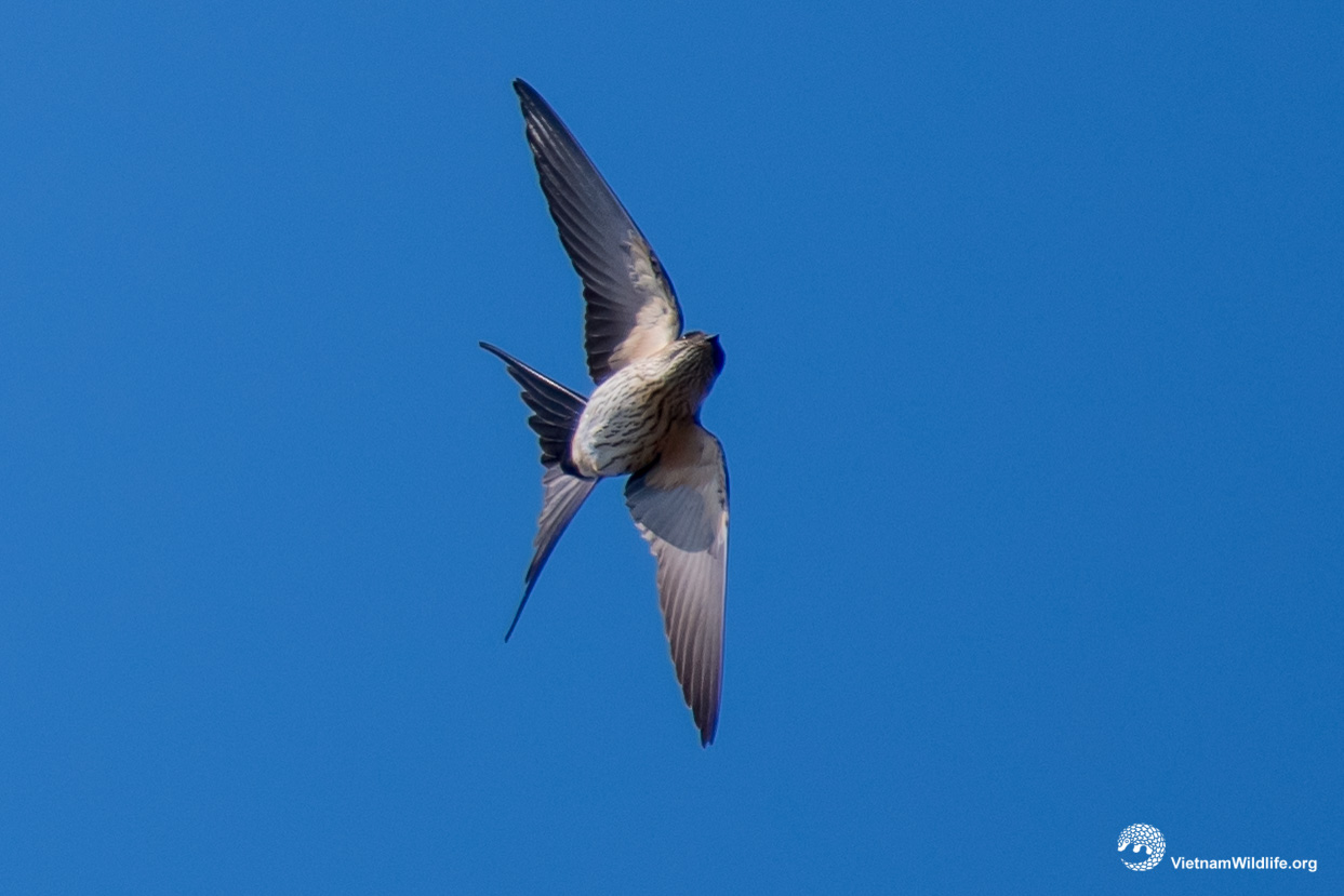 The red-rumped swallow is the medium sized species in the swallow group (about 16 cm). It has orange-rufous neck-sides and rump, dark blue head and upperparts with little white spots, dark-streaked whitish