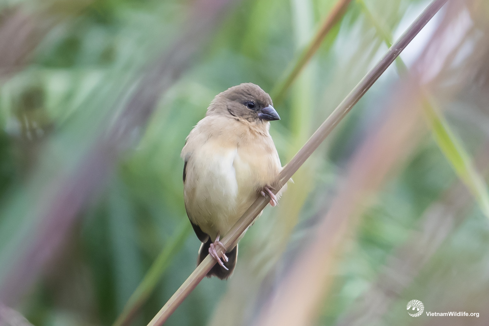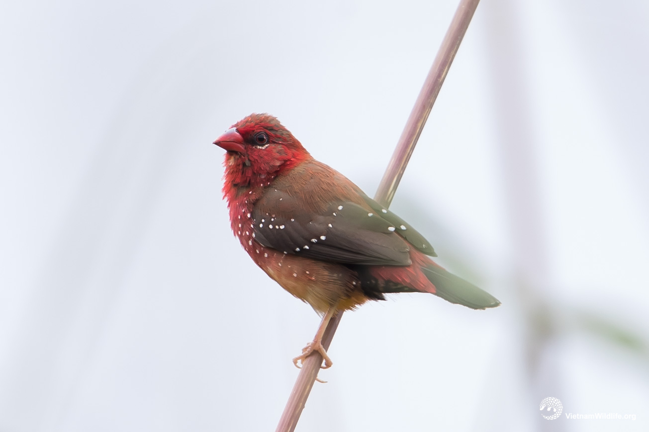 Yellow bellied avadavat is a small sized species in munia group (about 10 cm). The male in breeding season is very colorful with bright red plumage white spotting on scapulars, brown wing and upper-tail and yellowish-orange belly. Female has mostly greyish brown with red bill and smaller white spotted wing. The first winter is like female but dark brown bill.