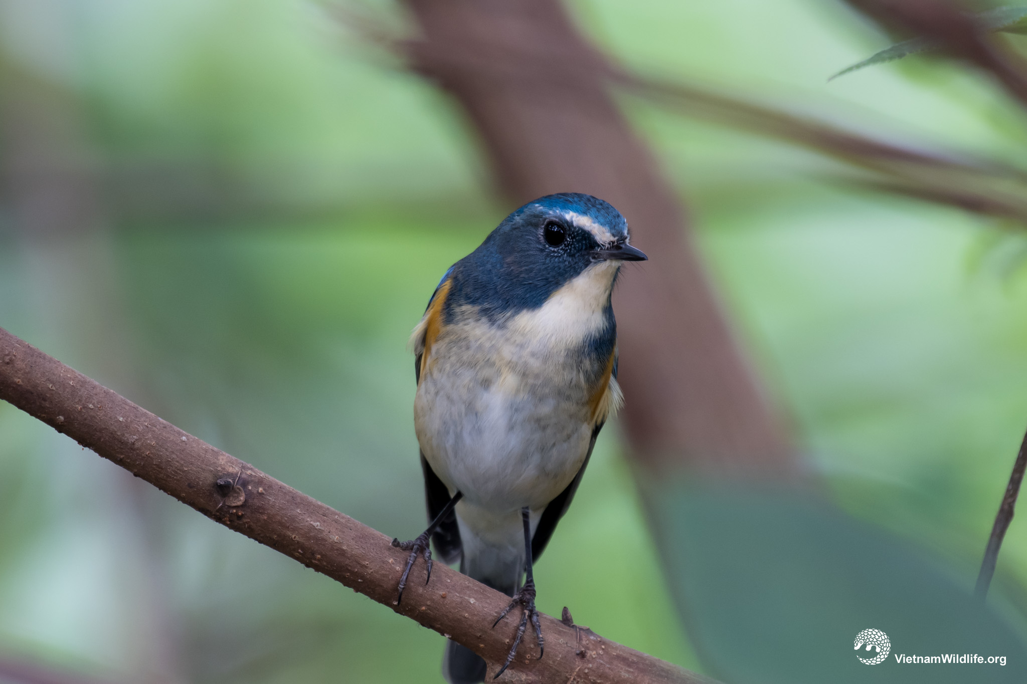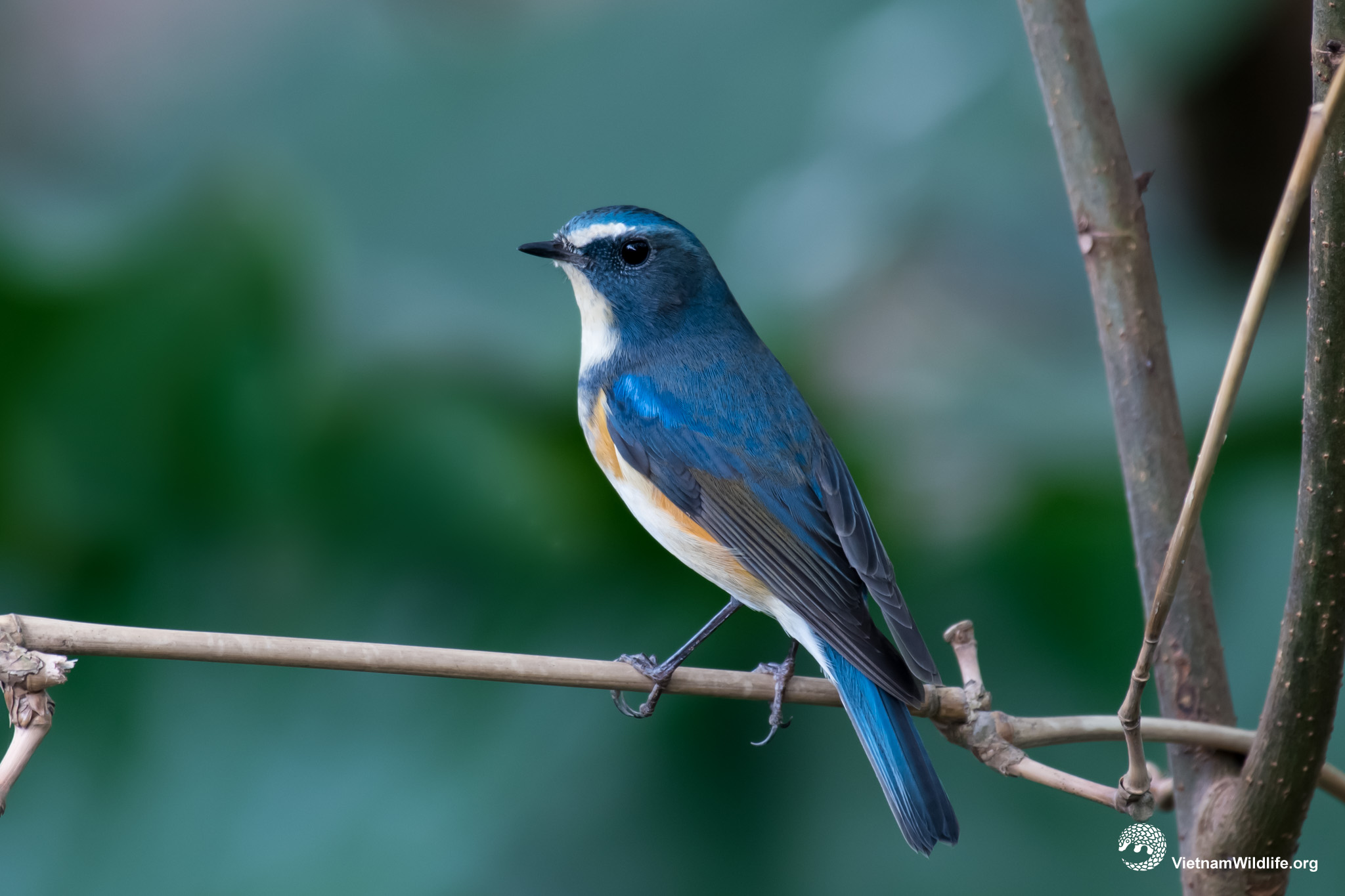 Red franked bluetail is slightly small size in flycatcher group (13-14 cm). The both sexes a white throat, a small, thin black bill, a blue tail and rump, and orange-red flanks and greyish-white underparts. The male has dark blue upperparts, while female is plain brown upperparts.