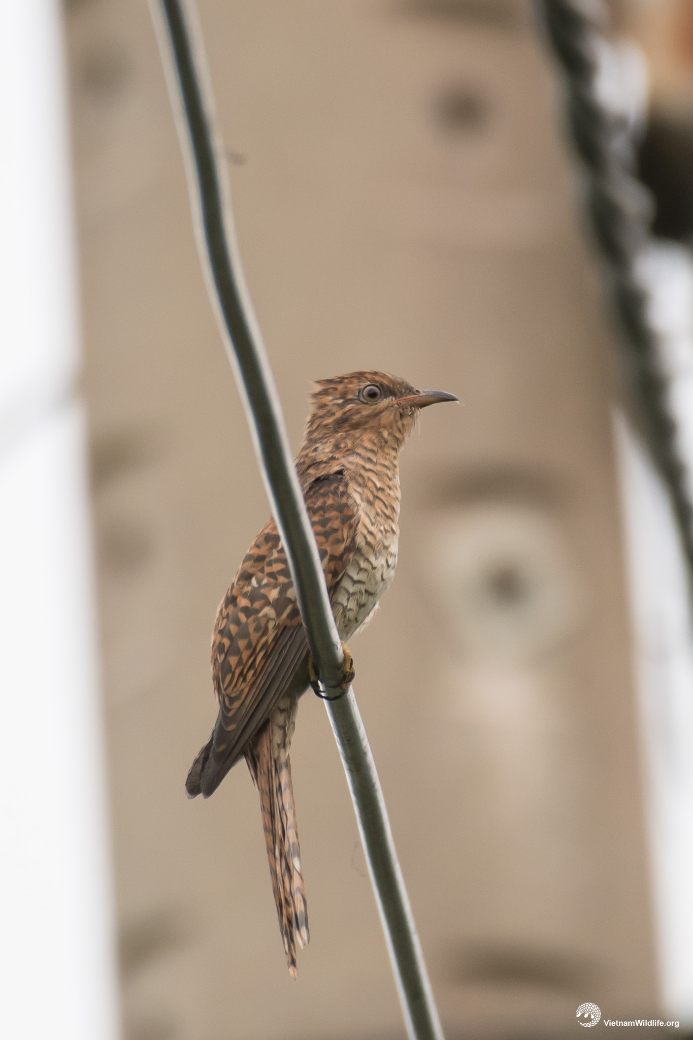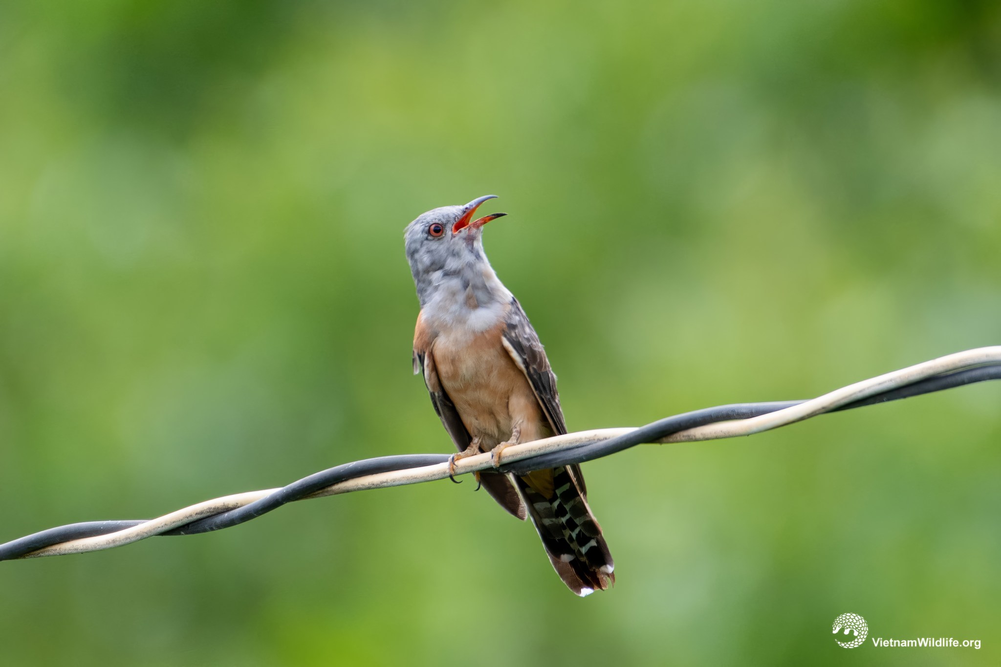 Plaintive cuckoo is a fairly small cuckoo with it’s length of 22 cm . The adult male has grey-brown upperpart and orange underpart. It has grey head, throat and upper breast. It has white tips to the tail feathers. The legs and feet are yellow, the eye is red.