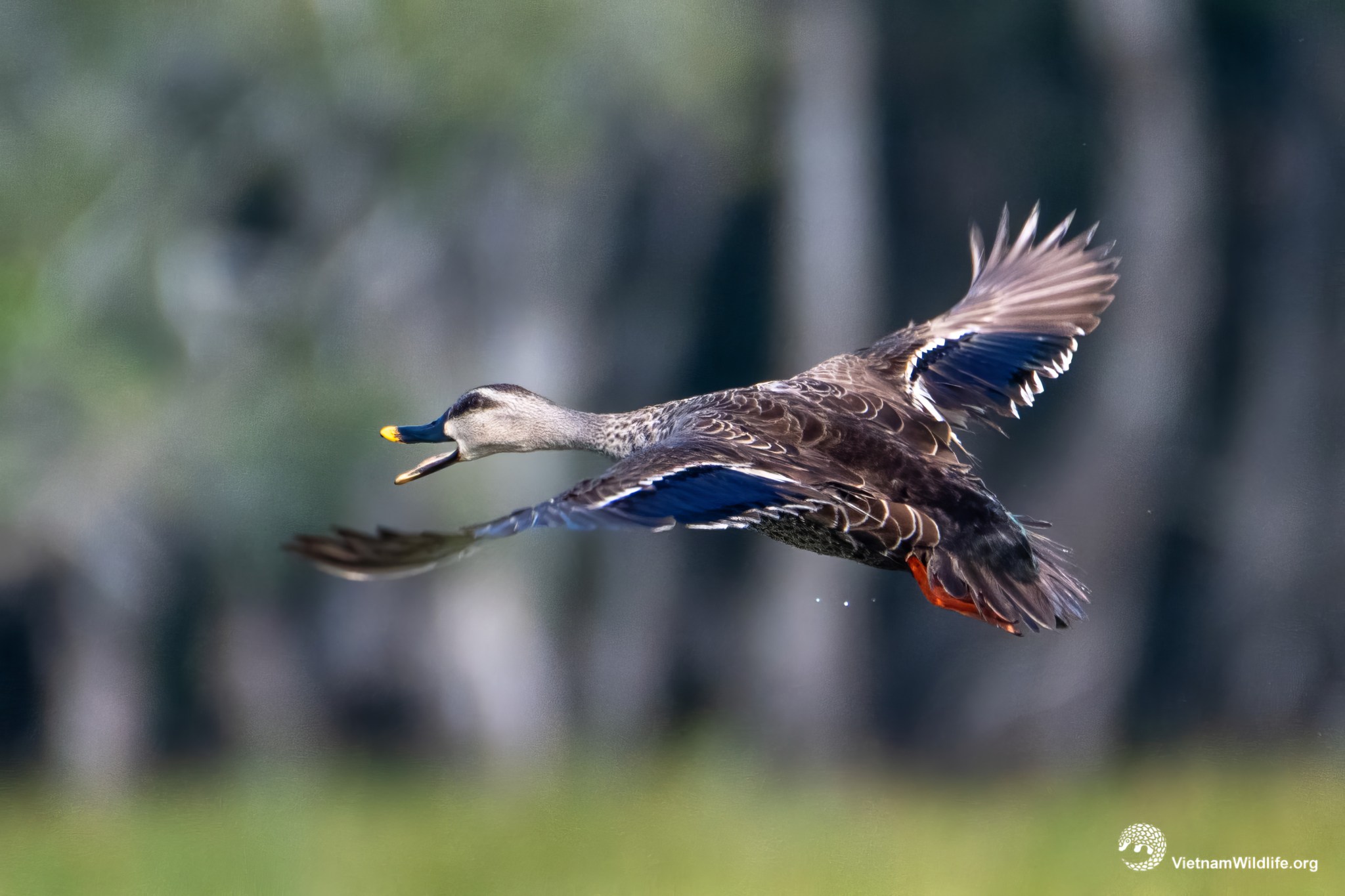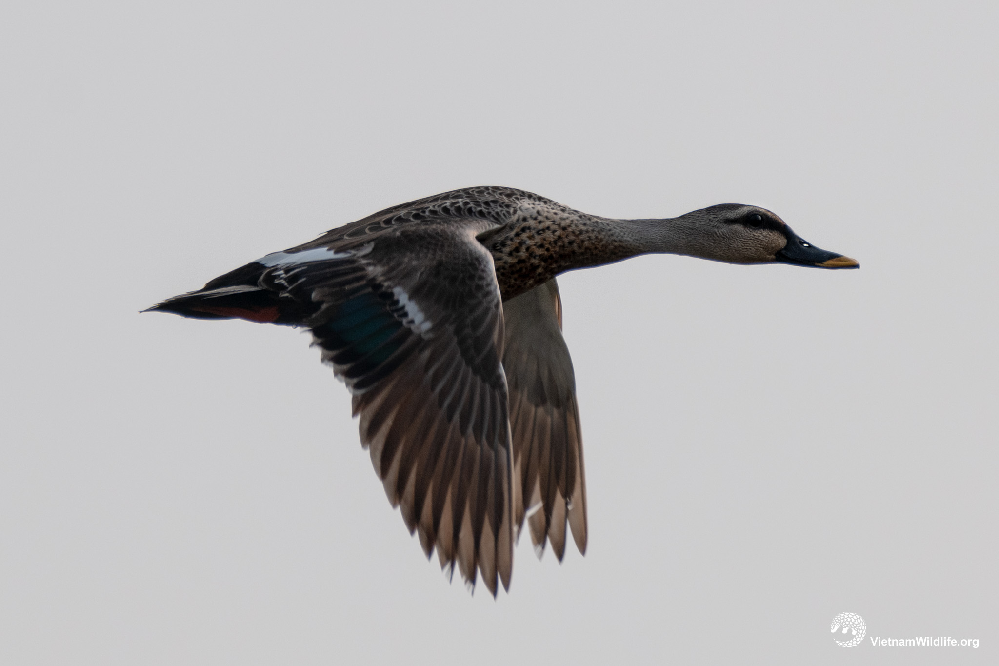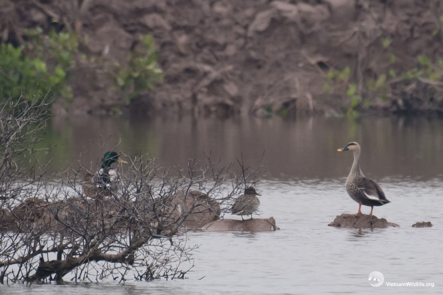 Indian spot-billed duck is a big sized species in the duck group (about 60cm). It looks like Chinese spot-billed duck but lack the dark stripe from below eye. It has sharply contrasting blackish crown and eyestripe, distinctive blackish bill with broad yellow tip, dark brown with narrow buffish fringes upperparts and paler breast and franks with dark brown streaks and mottling;