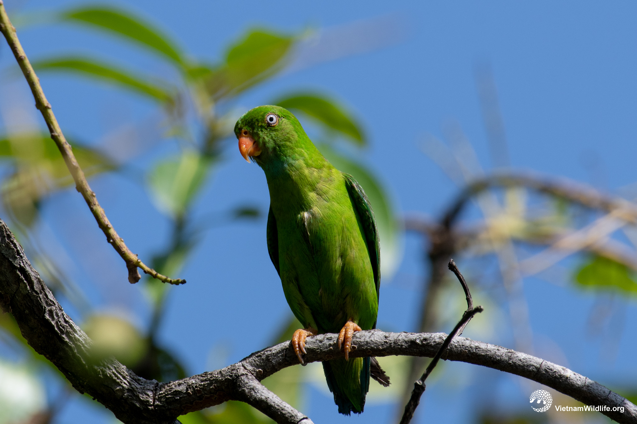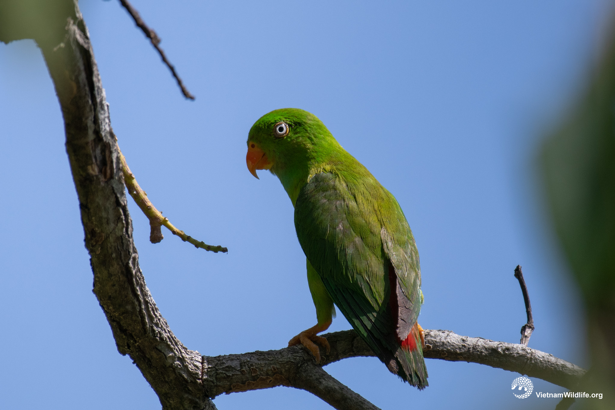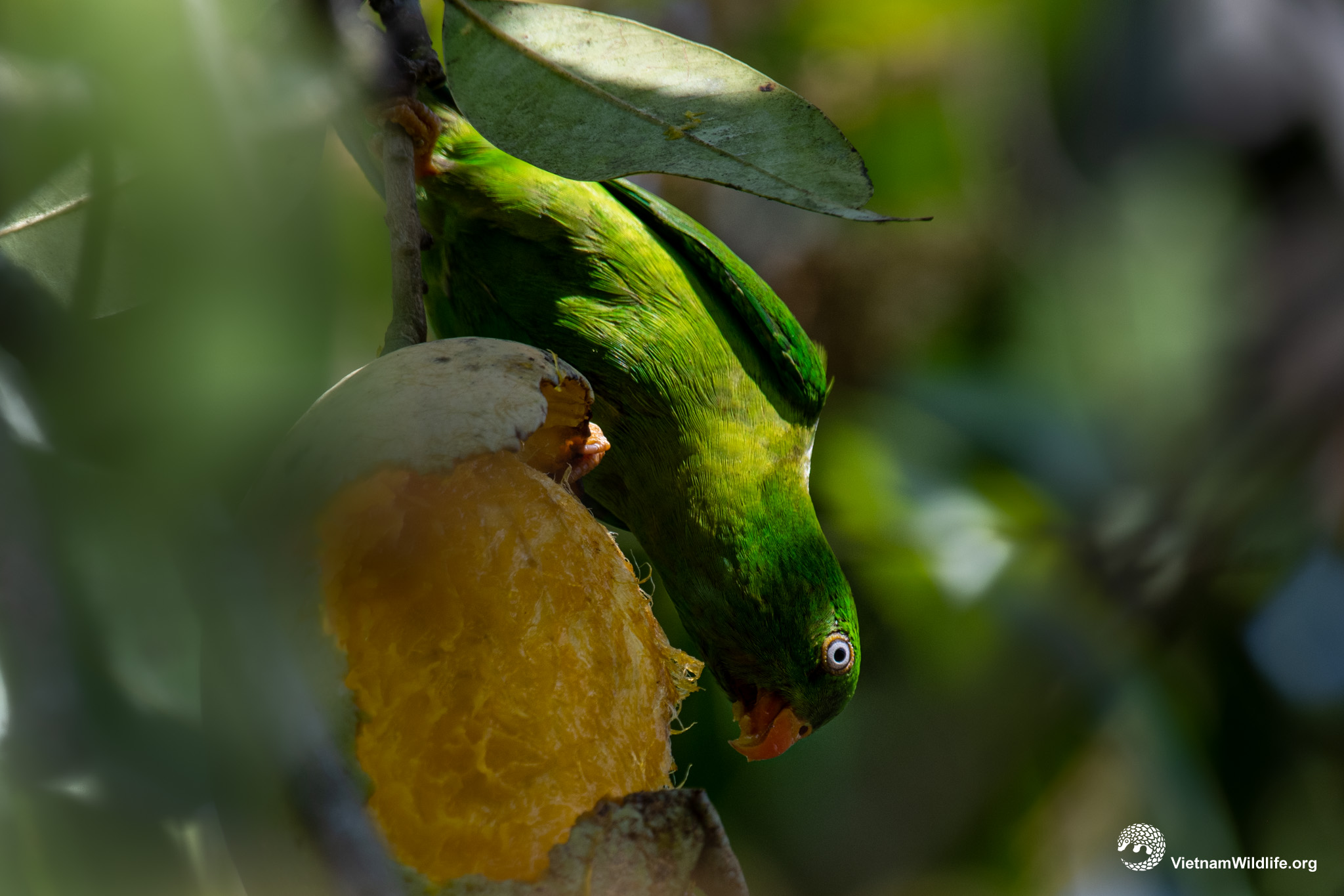 Vernal hanging parrot is the smallest species in the parrot group (about 14 cm). It has a distinctive white eye-rings, bright green plumage, contrasting red bill and back (to uppertajl-coverts), dull yellow legs. Male has a light blue flush on lower throat/upper breast but not female.