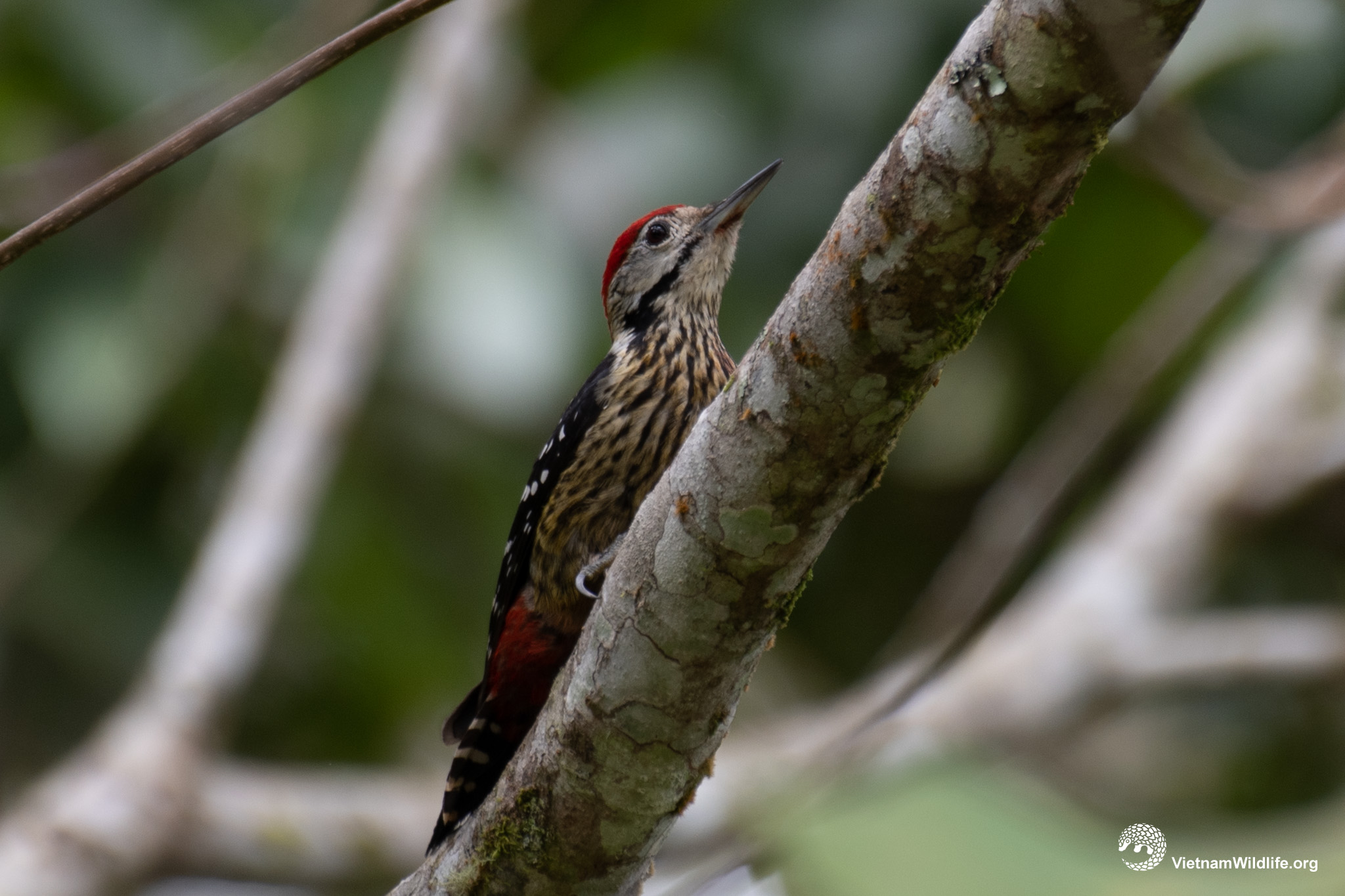 Stripe-breasted woodpecker is a small sized species in the woodpecker group (about 20cm). Male has distinctive bright red crown, whitish headed-side, black moustachial stripe to neck, yellowish underparts with heavy blackish strips and red patch under-tail convert. Female has black crown.