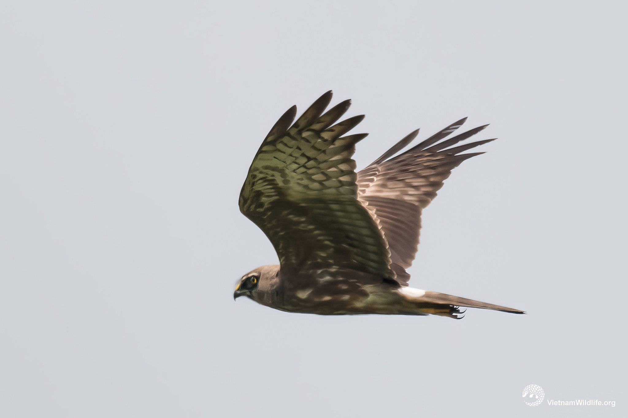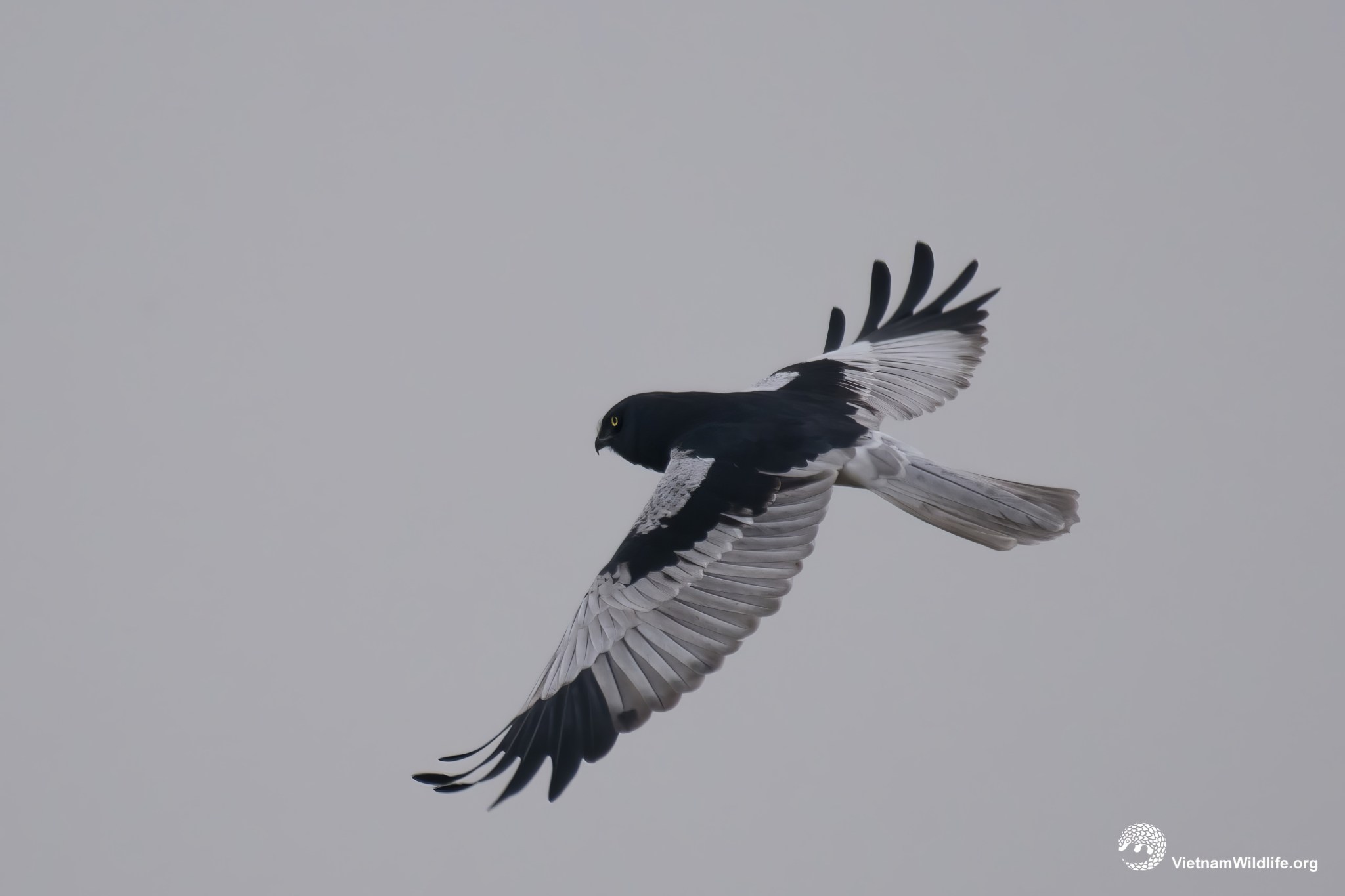 Pied harrier is a medium sized species in the harrier group (about 45 cm). The male and female are very different. The male has sharply contrasting plume (between black and white) with distinctively black head, black upperparts and white underparts. The female has white supercilium, greyish brown with whitish marks plume and whitish uppertail-covert band (clearly observed in flight).