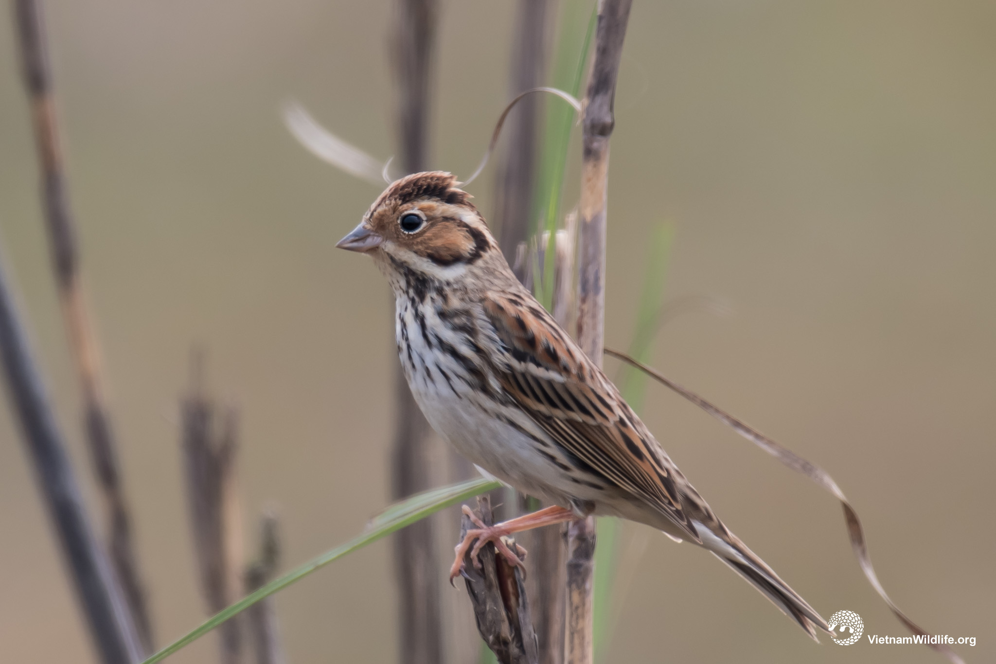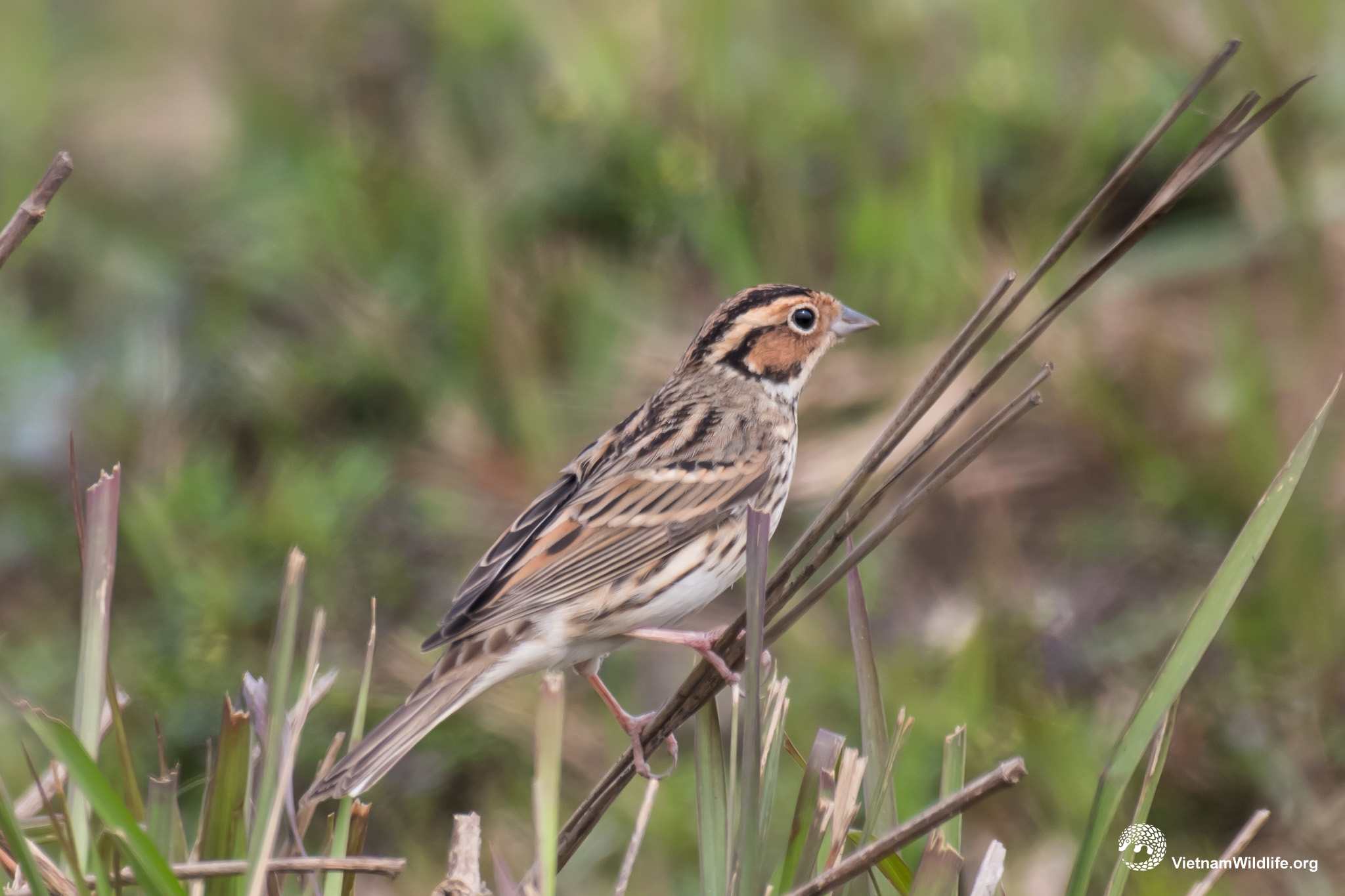 Little bunting is small sized species in bunting group (about 13 cm). It has overall brown plumage with distinctive broad blackish lateral crown-stripes, whitish eyering, rufous-chestnut ear-coverts and finely dark-streaked breast and flanks. Sexes are similar.