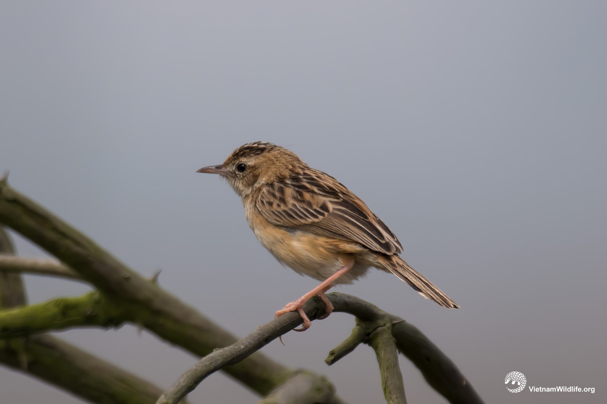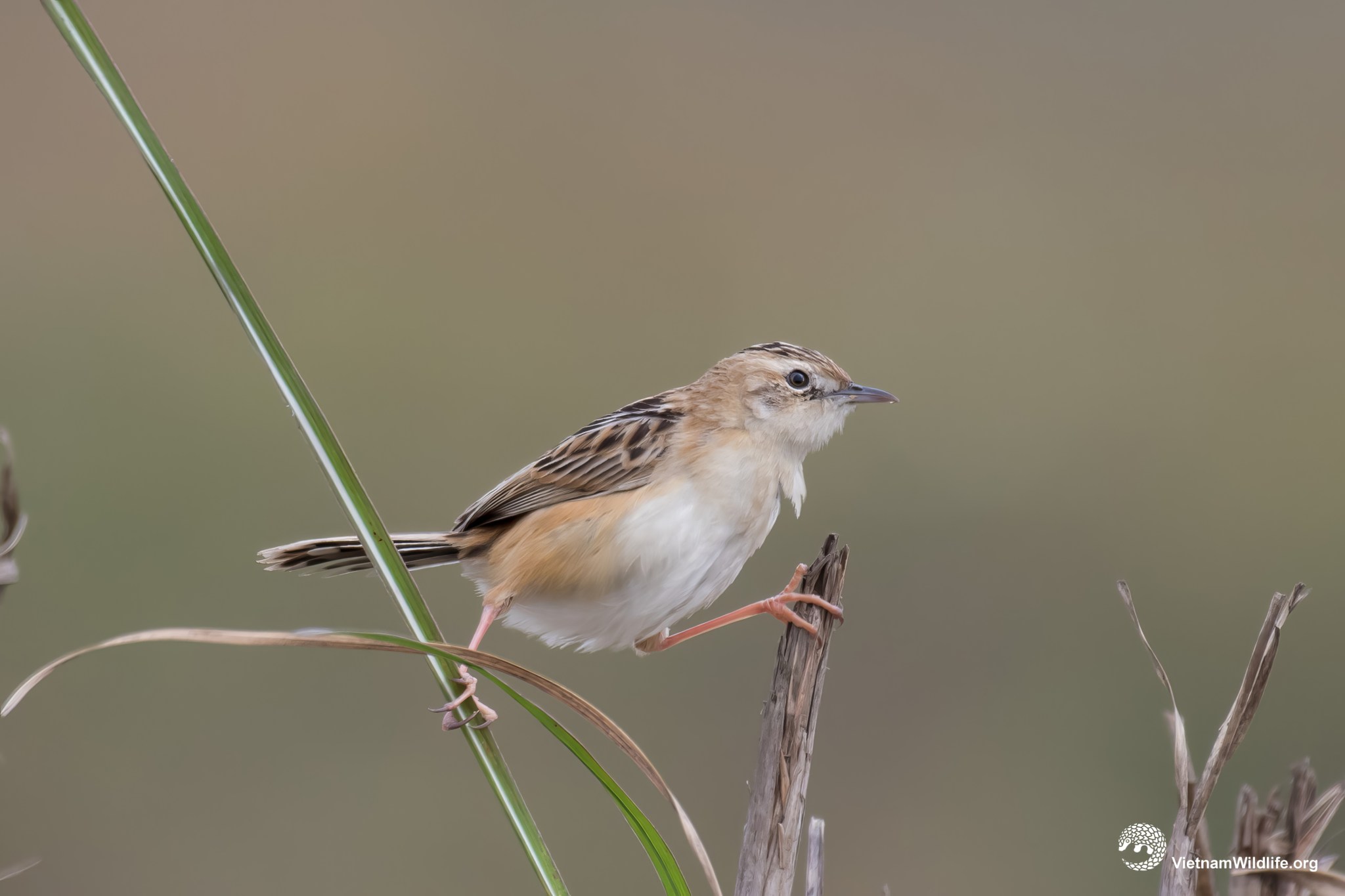 Zitting cisticola is small sized species in cisticolidae family (about 11 cm). It has short white supercilium, dark brown crown, fairly short rounded-tail, buffish-brown upperparts with dark streaks and whitish underparts. Sexes are similar.