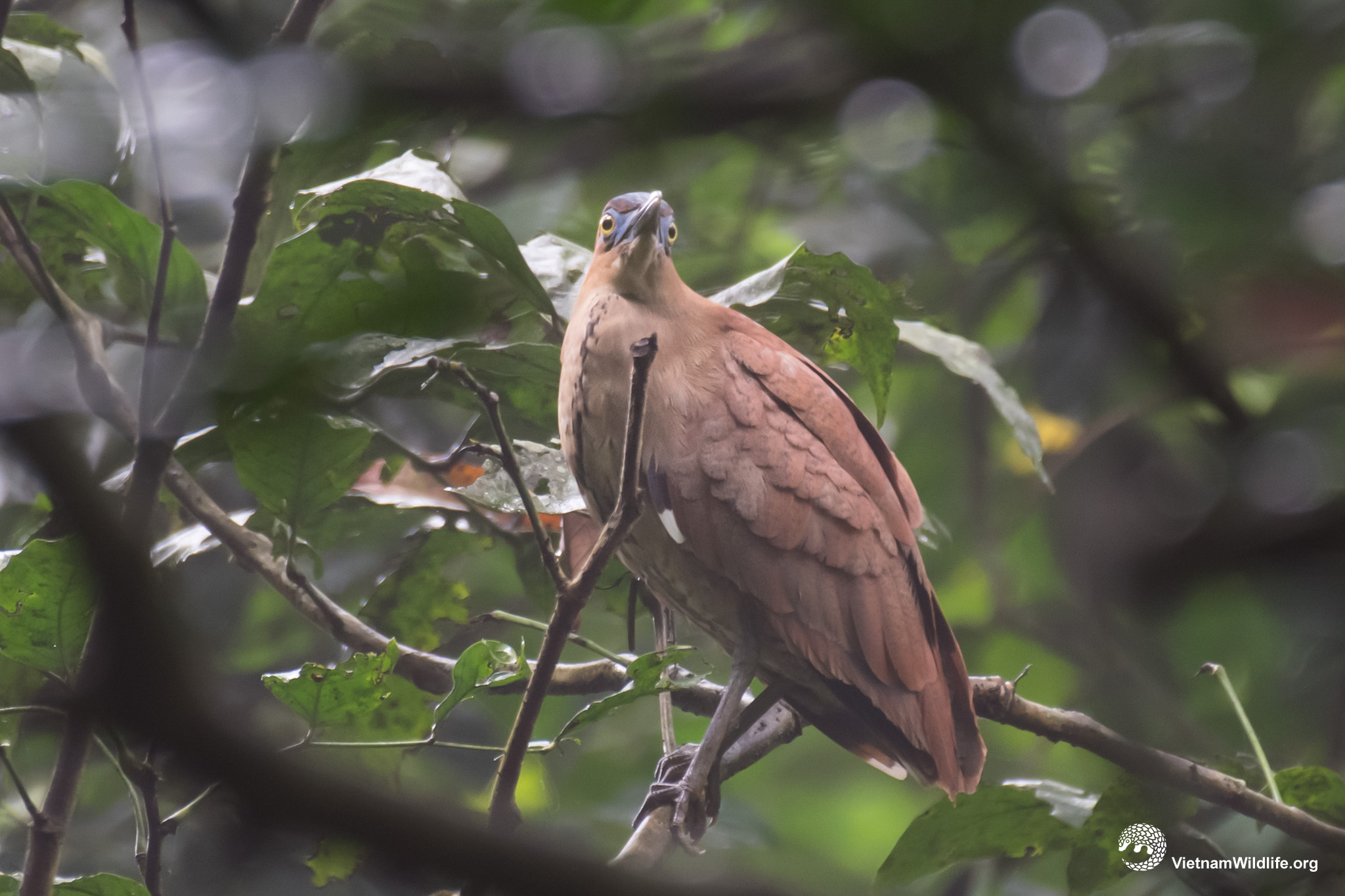 Malayan night-heron is a medium species in the heron group (about 50 cm). Adult has a distinctive deep rufous plumage with yellow eyering, blackish crown and long crest, blue to greenish-blue facial skin and greenish legs and feet. Male and female are similar