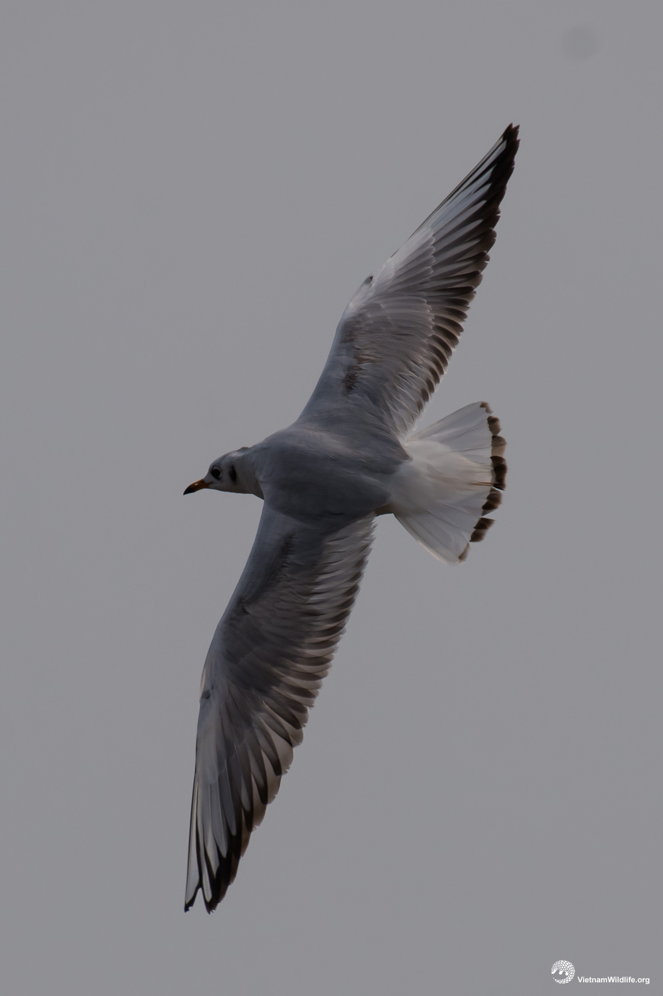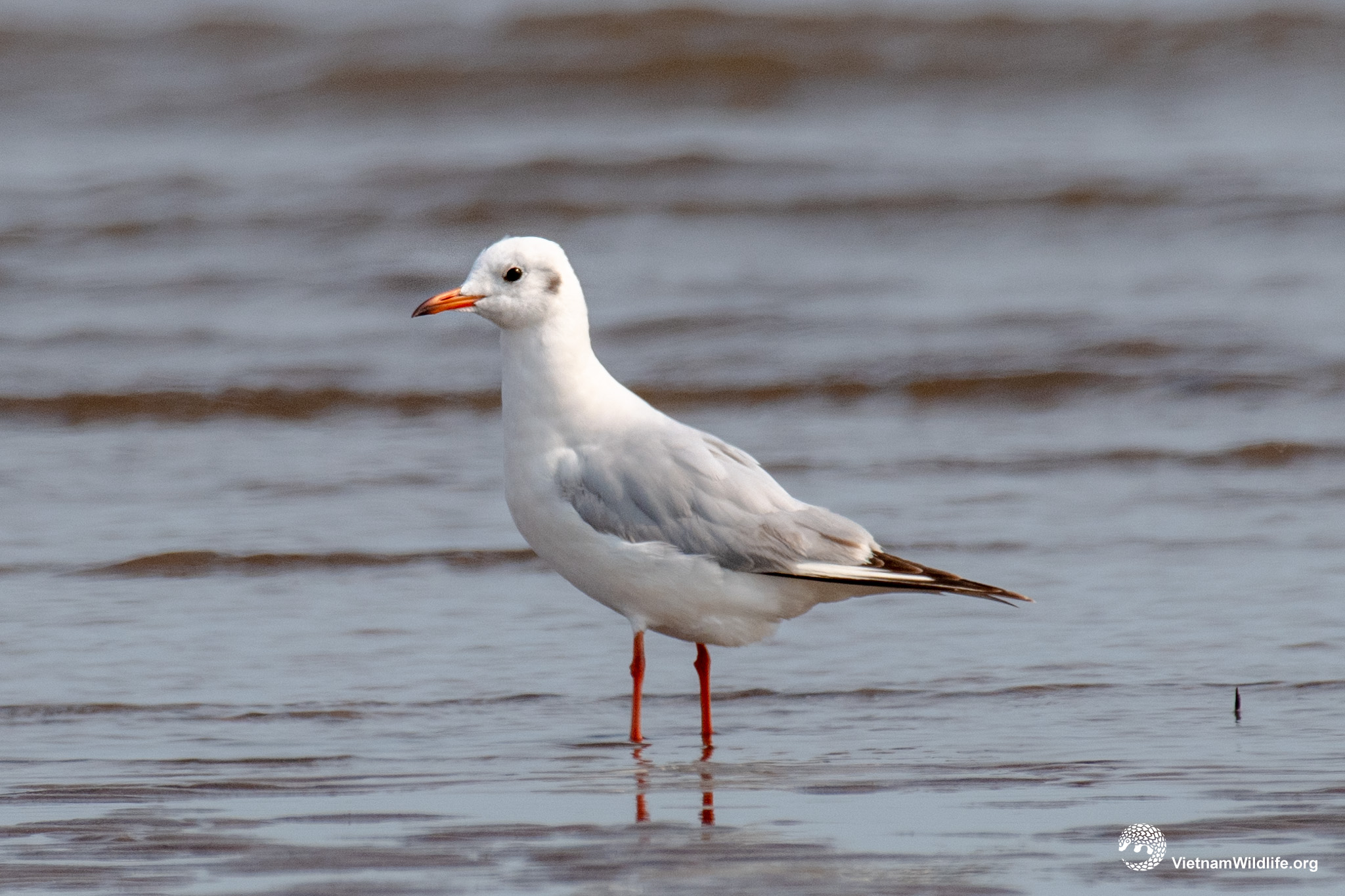 Black-headed gull is a relative small and slim species in the gull group (about 35 cm). In non-breeding season, the adult has a white head with prominent dark ear-spot and blacktipped red bill, white neck and underparts, pale grey upperparts and dark red legs and feet.