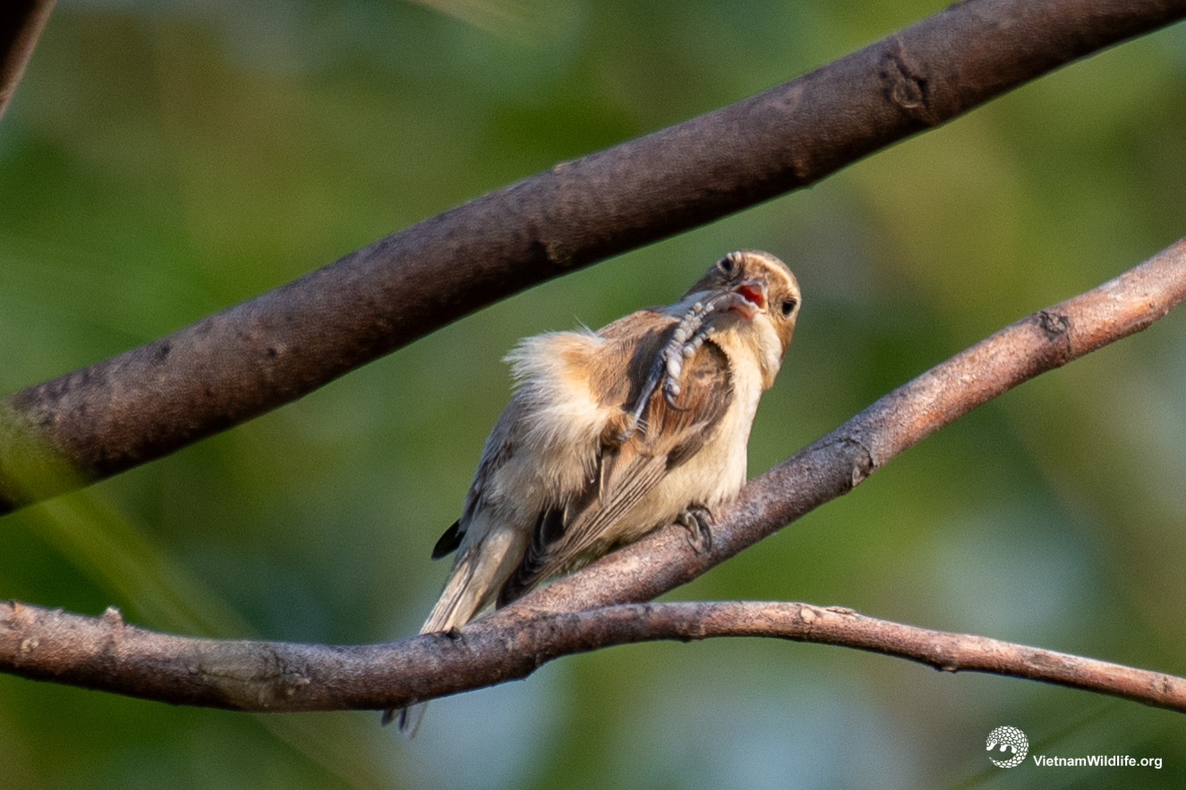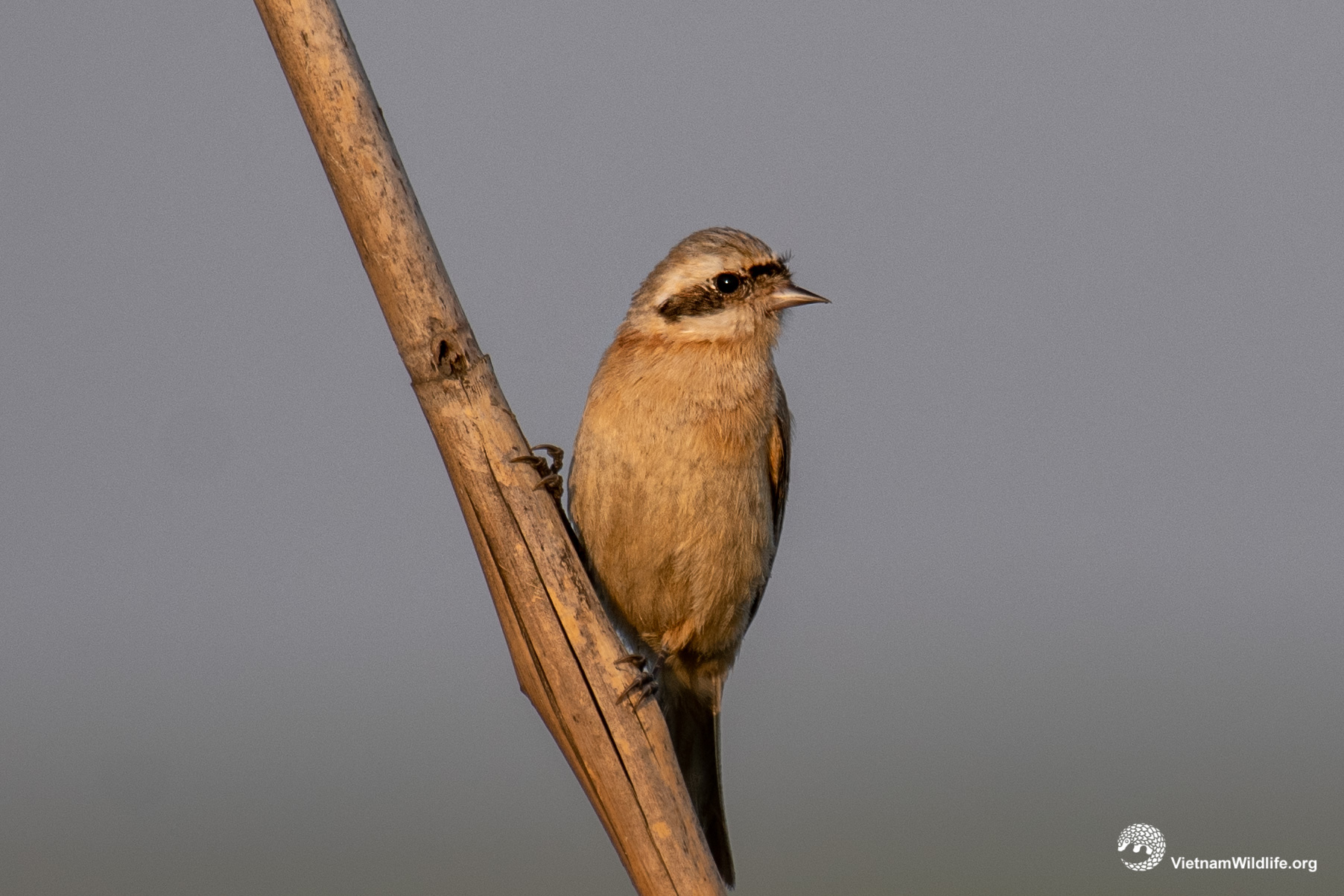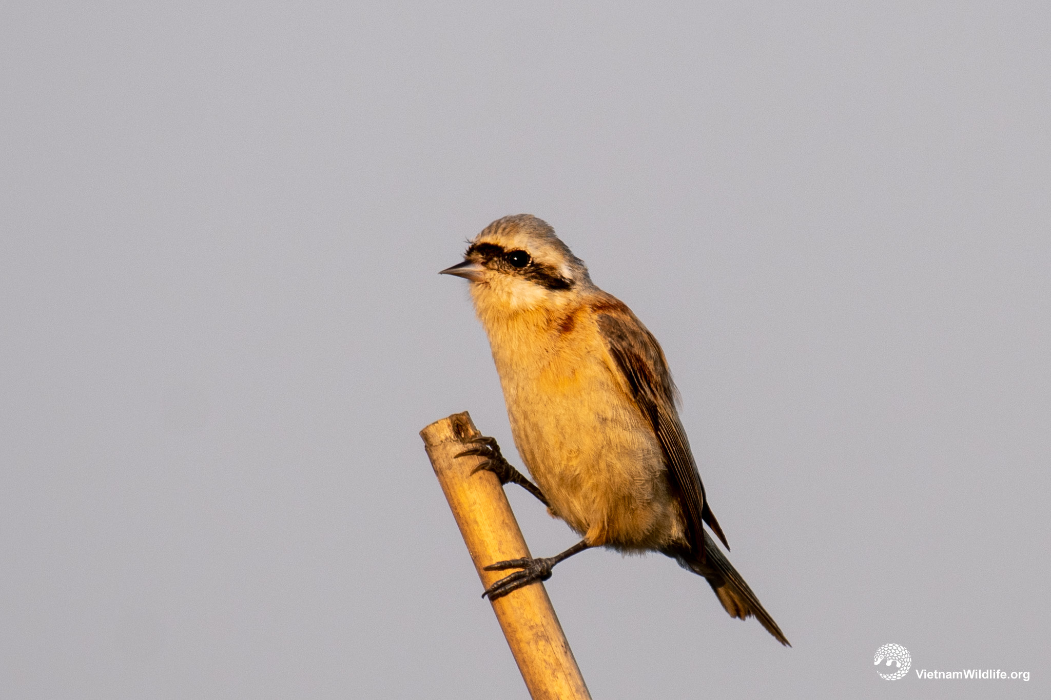 Chinese penduline tit is a very small species in the penduline tit group (about 10 cm). It has a short and pointed dark bill. The male (non breeding) has a greyish-brown head with white-bordered black mask, mostly buffish-brown plumage with dull chestnut band across upper mantle. Female is similar to the male but has dark brown mask and crown.