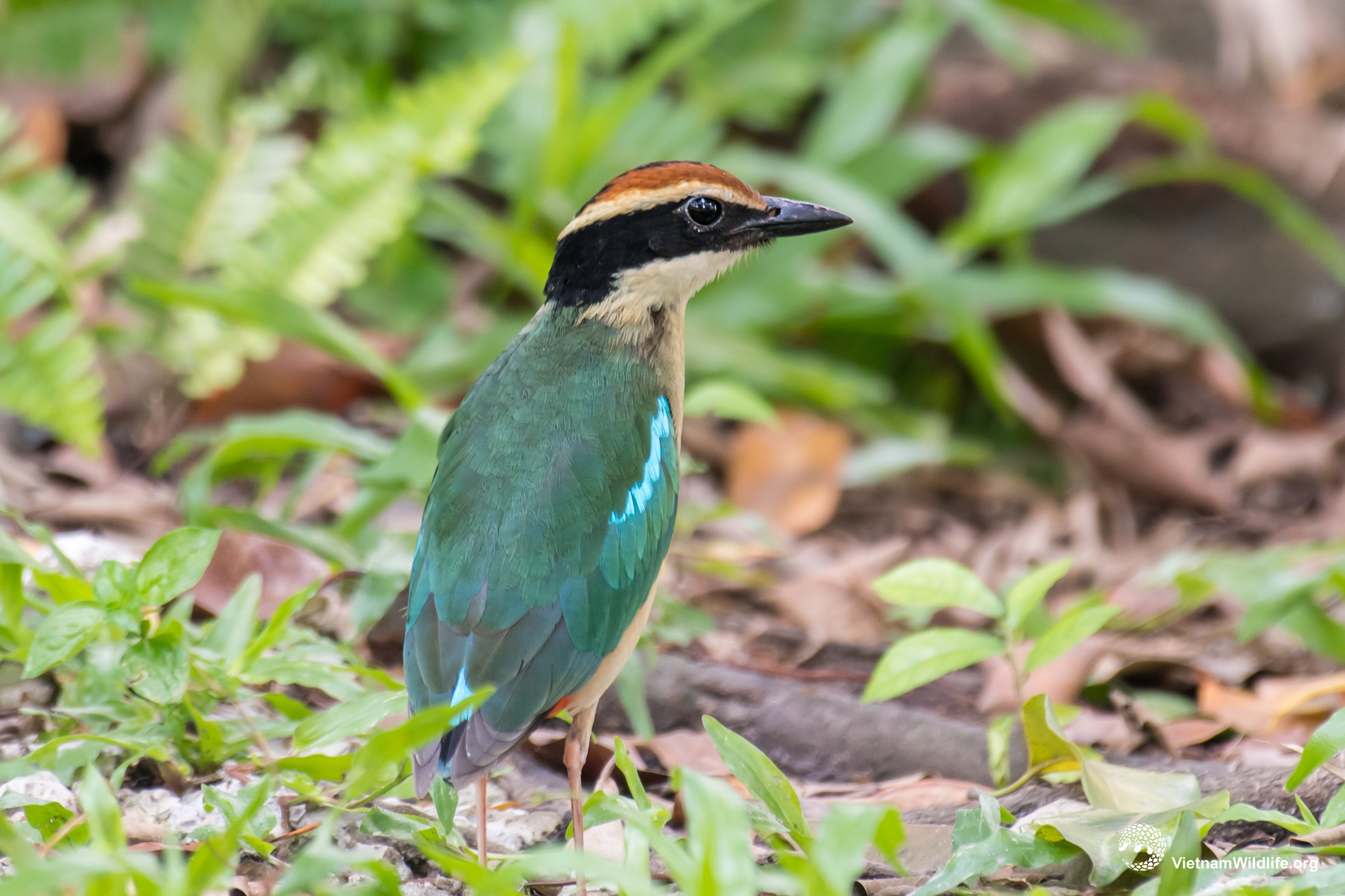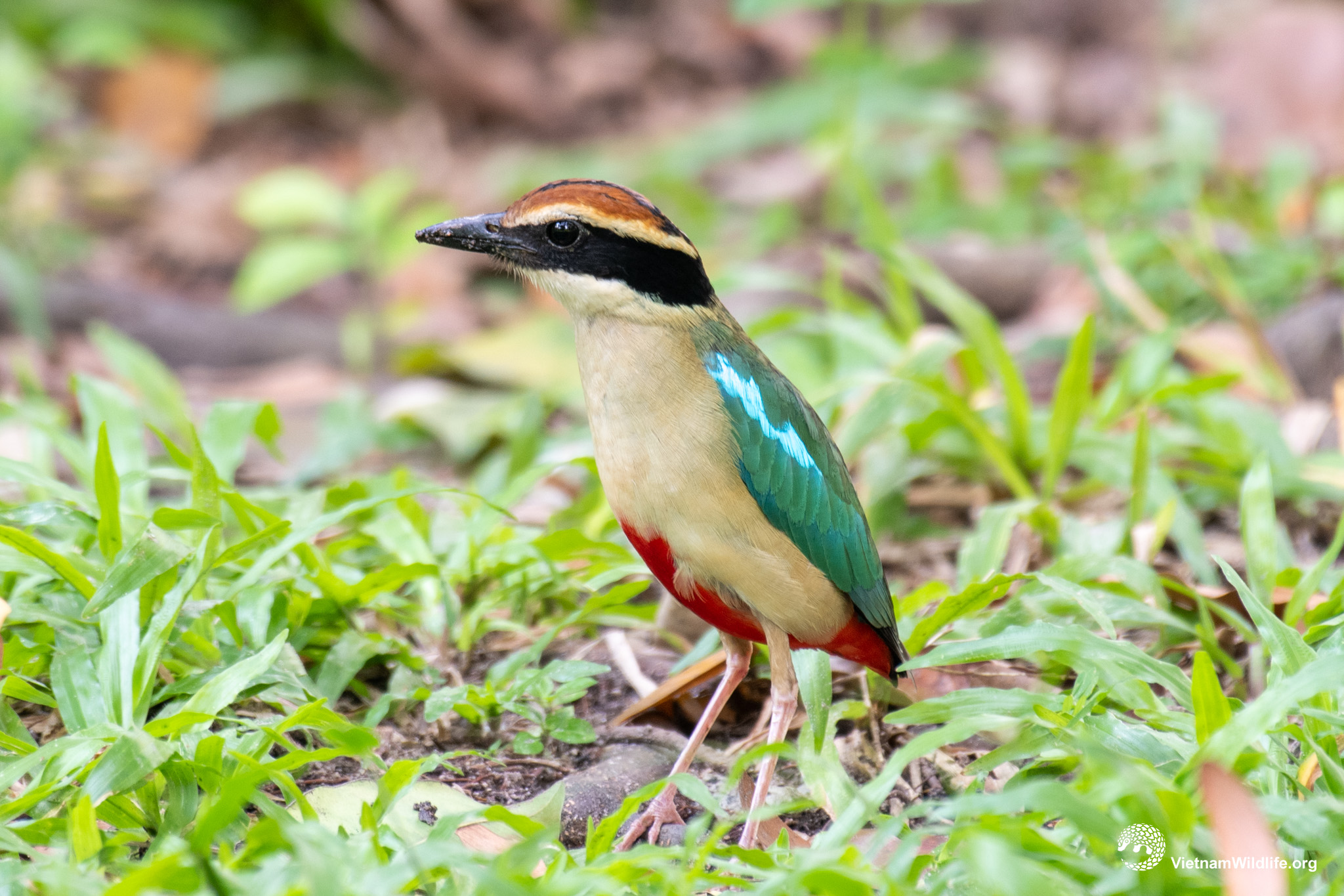 Fairy pitta is a small sized species in the pitta group (about 17 cm). It has a rufous crown sides and narrow whitish-buff supercilium contrasting with broad black eye-stripe, green back and wing bows with distinctive blue patch on wing-coverts, pale buff underparts with red vent. Male and female are similar.