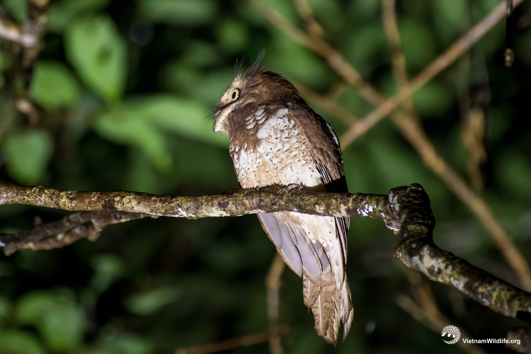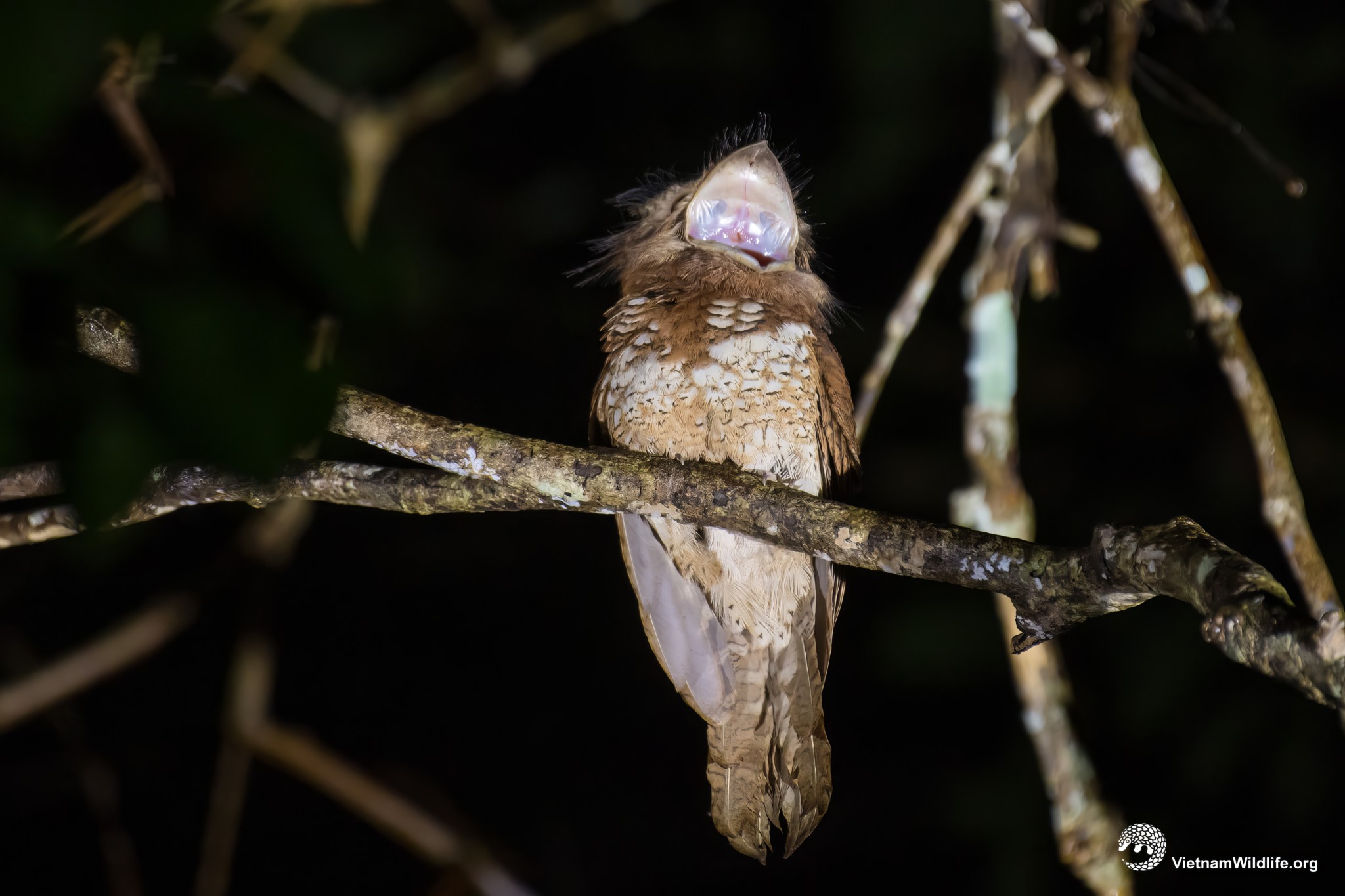 Javan frogmouth is a medium sized species in the frogmouth group (about 24 cm). It has a distinctive broad bill, yellow eyes, mostly warmish brown upperparts and buffy white underparts with more rufous throat and breast
