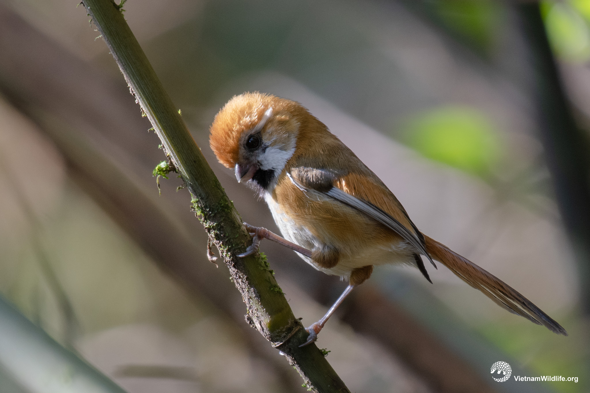 Golden parrotbill is one of the smallest species in the parrotbill group (about 11 cm). It has buffy-rufous crown, nape and back, distinctive narrow white supercilium, white malar areas, black throat and rufous-buff with whitish center underparts. Male and female are similar.