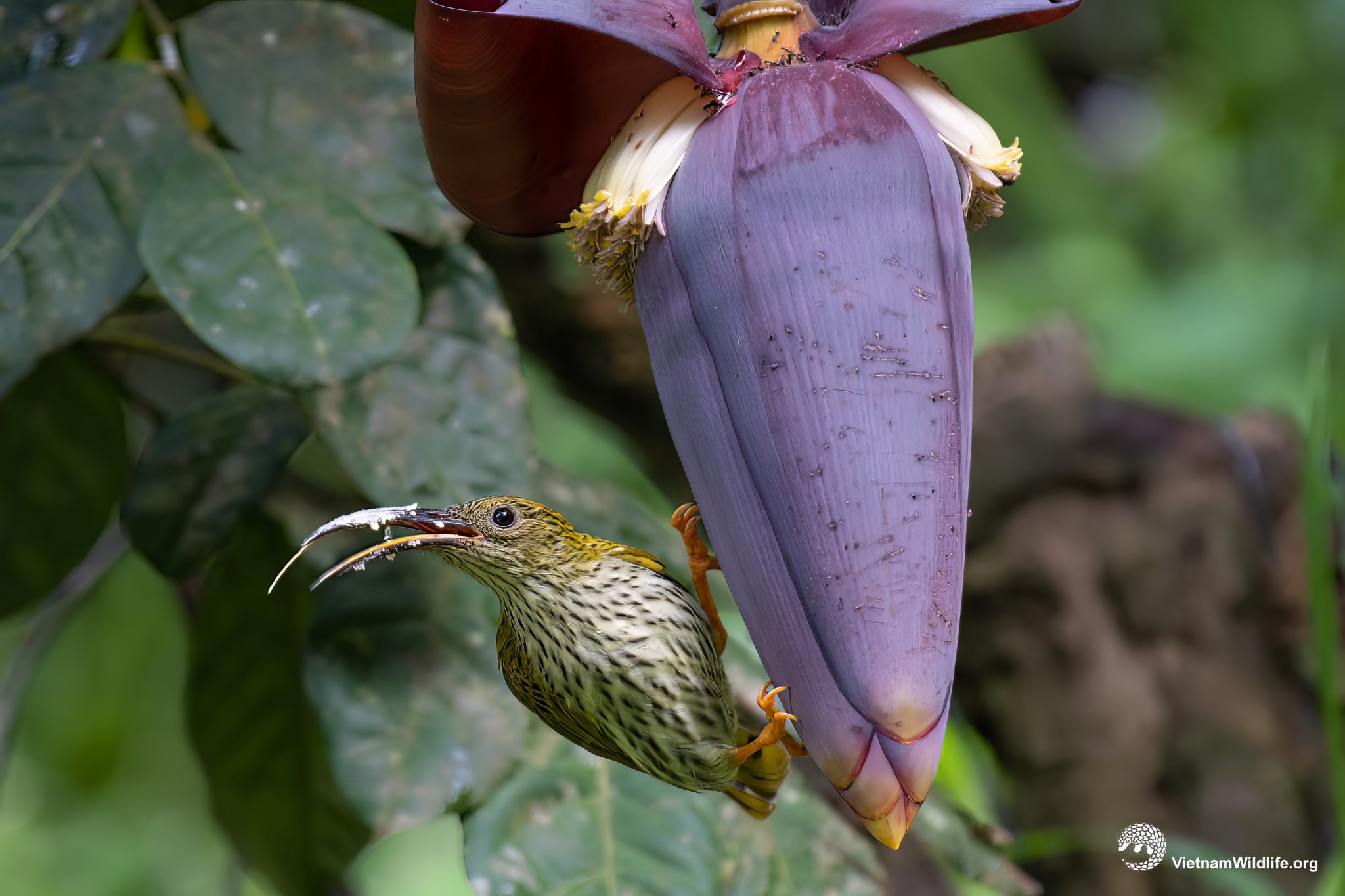 Streaked spiderhunter is medium to large sized species in spiderhunter group (about 20 cm). It has a heavily streaked head, very large and long bill, yellow olive upperparts and whitish underparts with small olive streaks. Male and female are similar.
