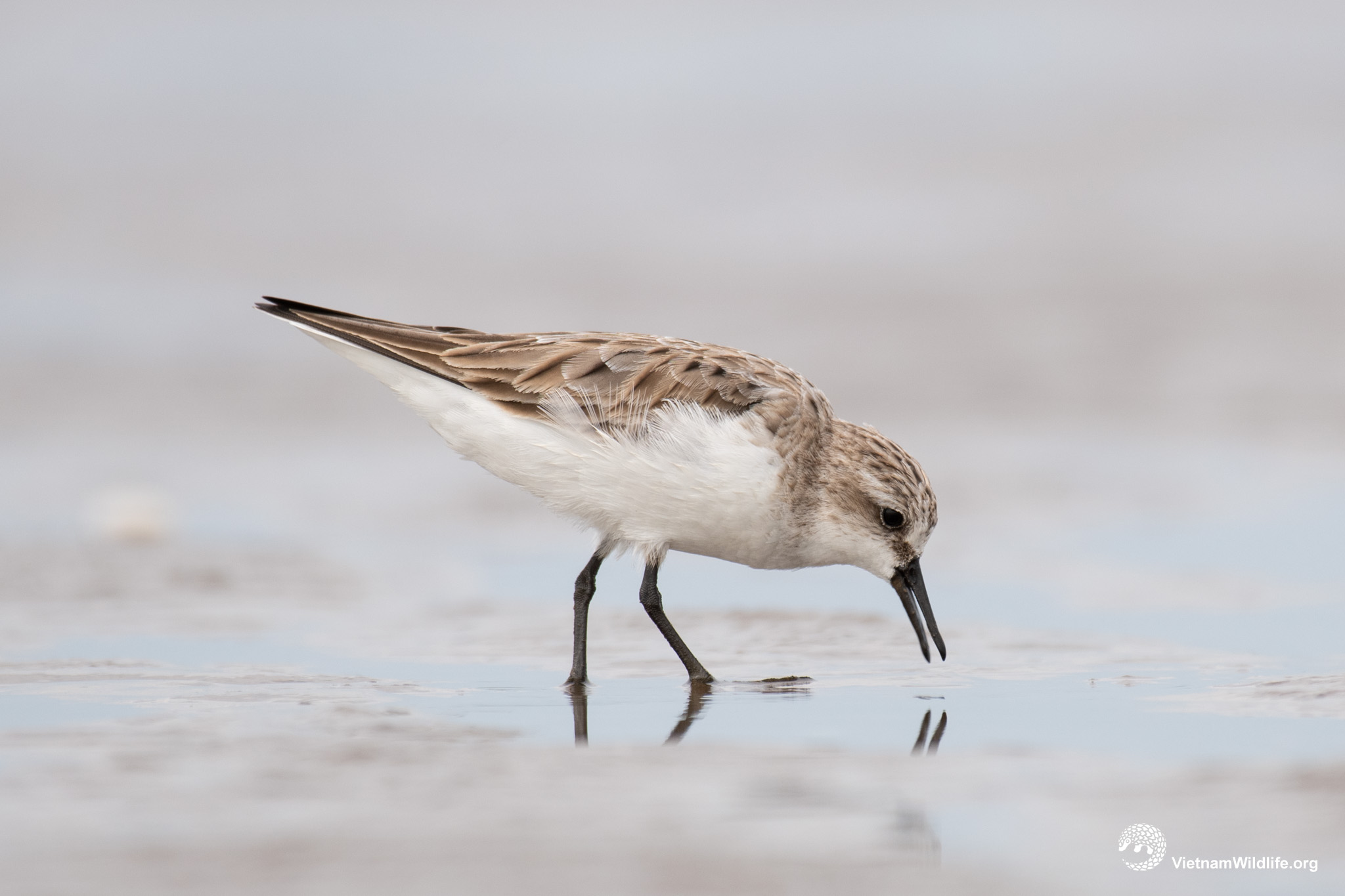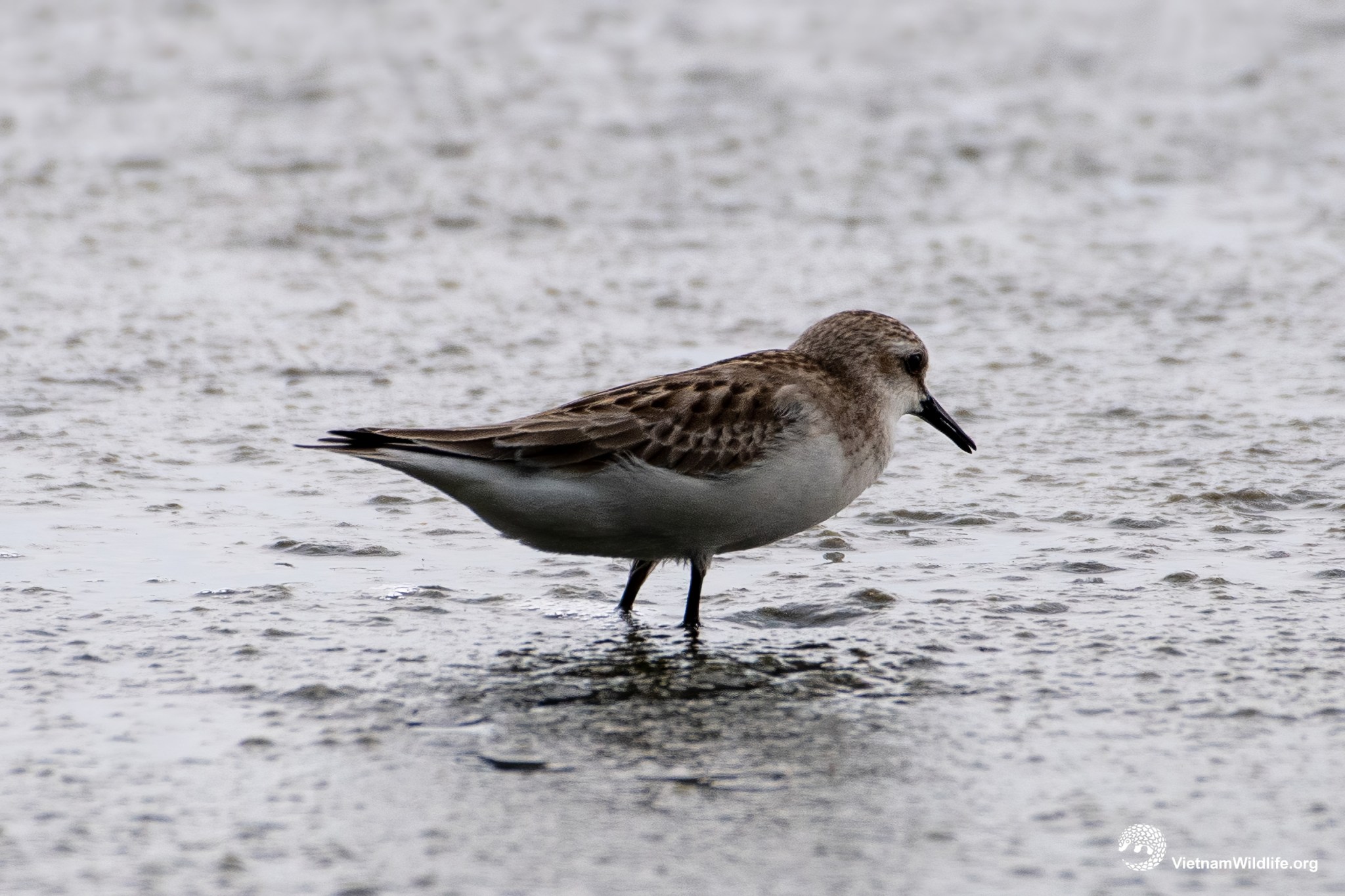 Red-necked stint is a small-sized species in the sandpiper group (about 15 cm). In non-breeding season, it has short white supercilium, thick and straight black bill, uniform greyish upperside with dark shaft-streaks, white underparts with fairly distinct greyish lateral breast-patches, and black legs and feet.