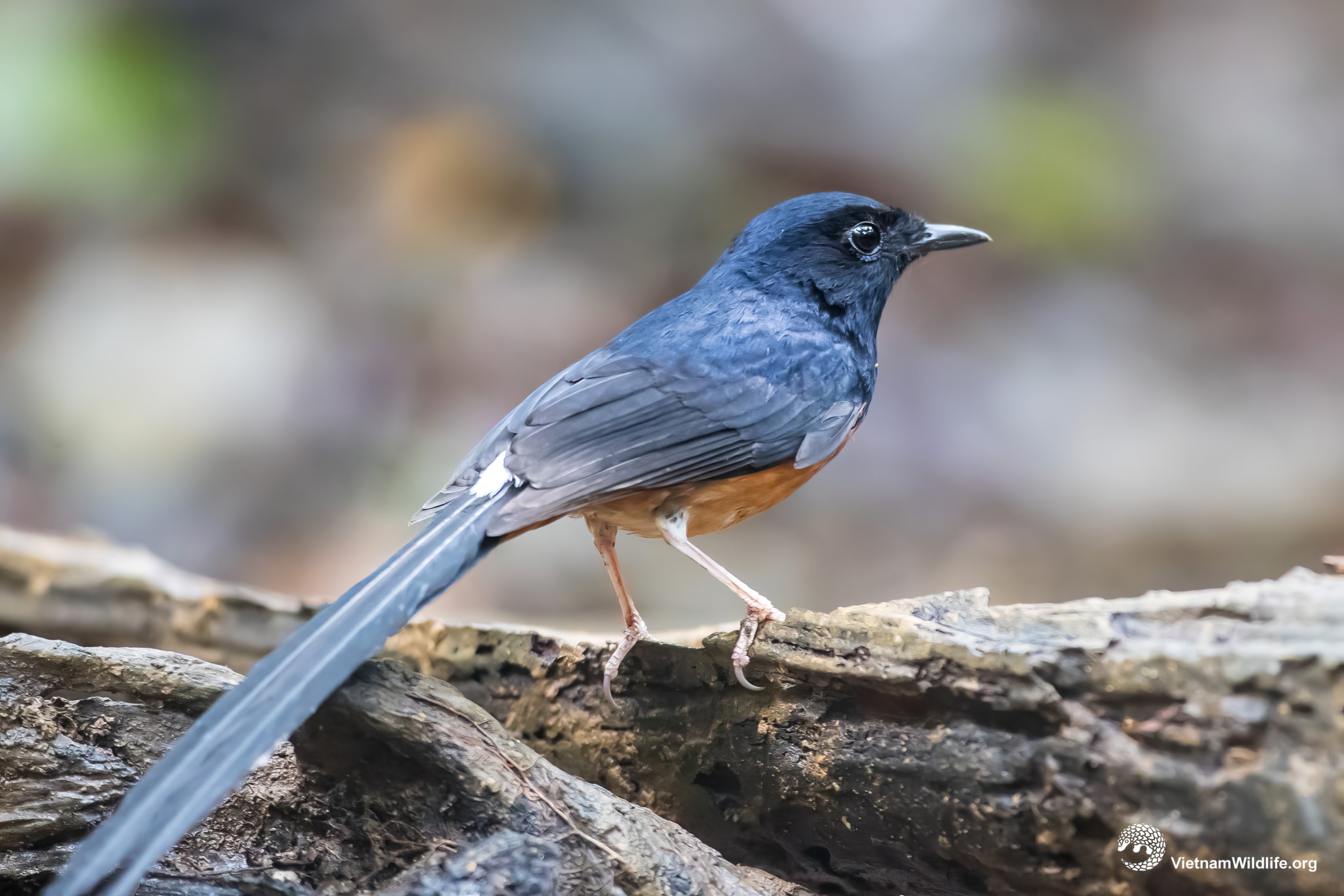 White-rumped shama is a large sized species (about 25cm) in the flycatcher family. Male and female are different especially upperparts. Male has glossy black head, neck and back with a chestnut belly and white feathers on the rump. It has a long black tail. Female is more greyish-brown head and upperparts.