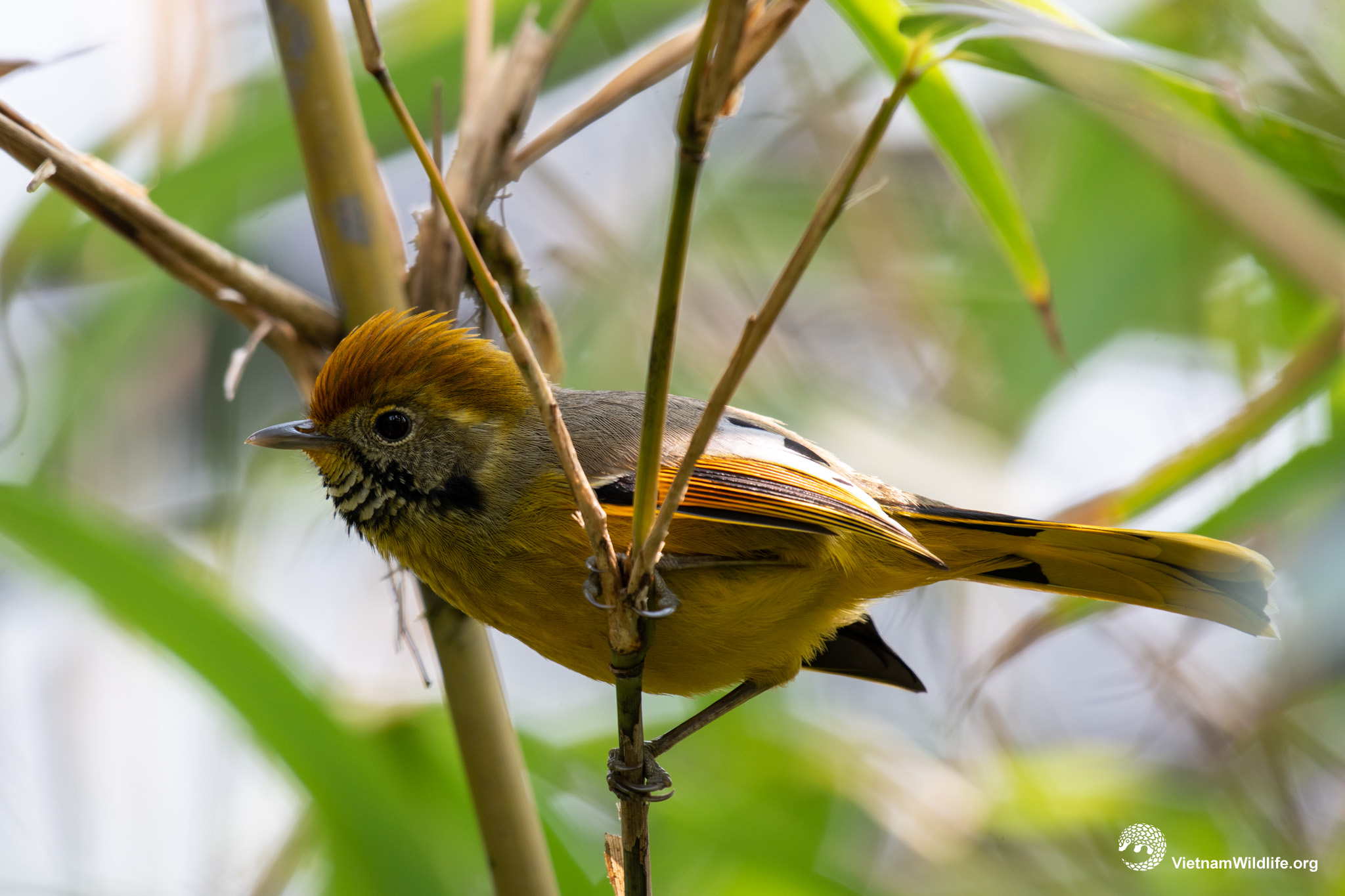Bar-throated minla is a large sized species among the minla group (about 17 cm). It has yellowish-rufous erected crown, white throat with black bars, olive-greyish upperparts, yellowish underparts and chestnut and black tail. Male and female are similar.