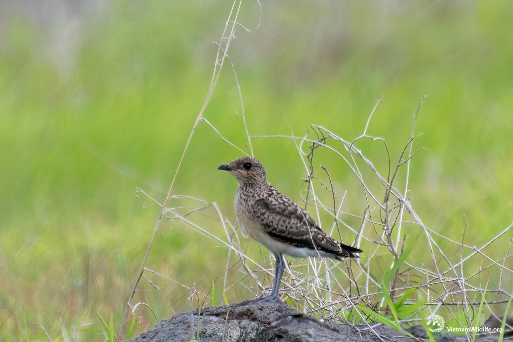Oriental pratincole is a large sized species in the pratincole group (about 23 cm). It has distinctive narrow black necklace contrasting with buff upper fore-neck and warmish brown throat, short bill with red bill-base, greybrown upperparts and whitish underparts. In flight, it has chestnut underwing-coverts. Male and female are similar.