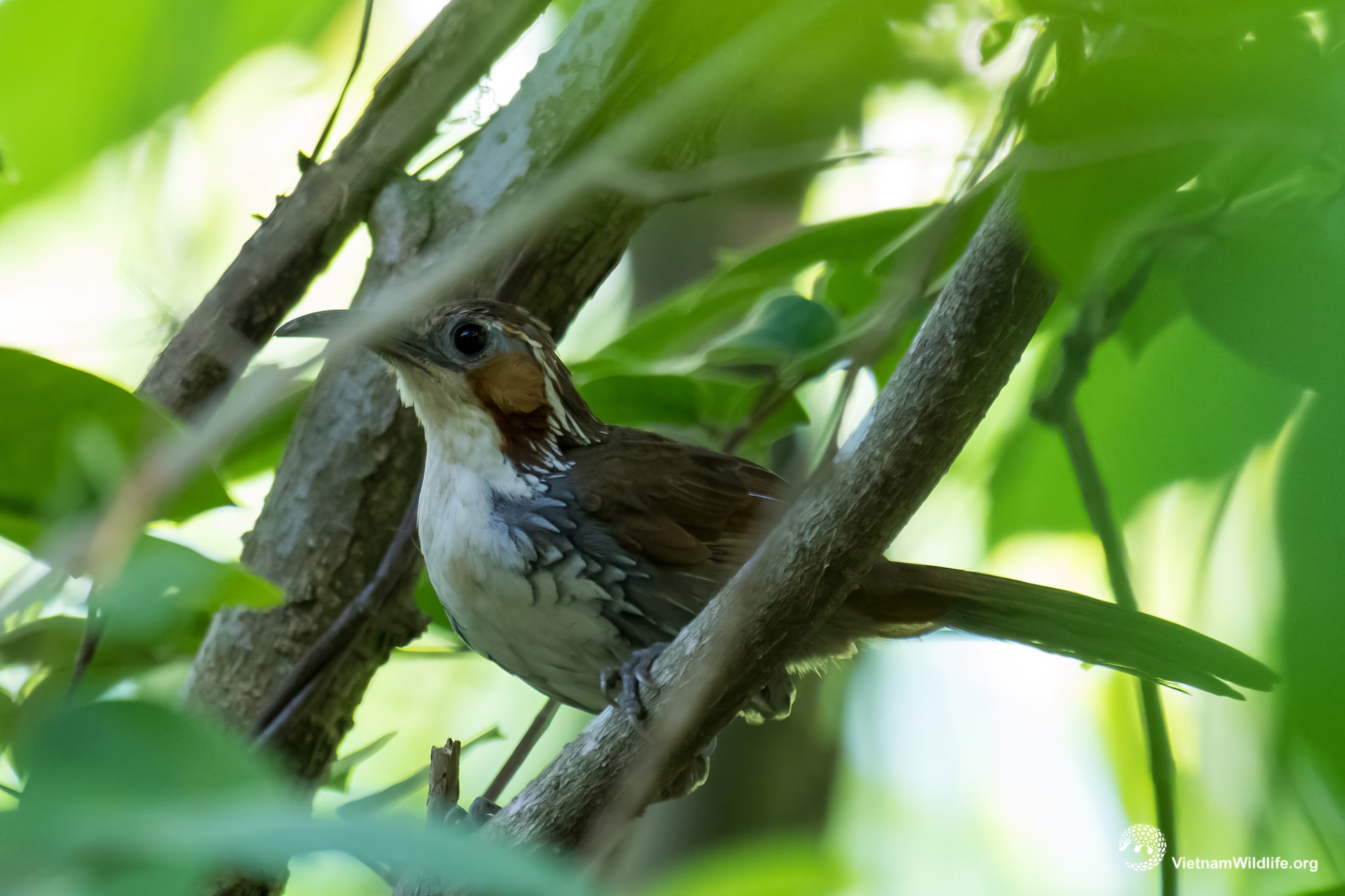 Large scimitar babbler is the largest species in the scimitar group (about 27 cm). It has a distinctive a brown and curved bill, long whitish supercilium behind eye to the neck sides, brown ear coverts, whitish underparts and dark brown upperparts. Male and female are similar.