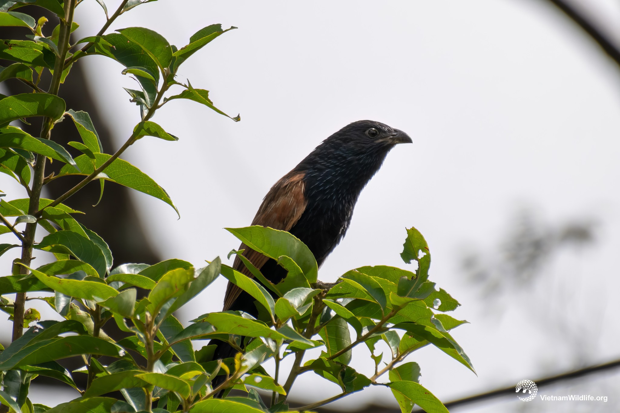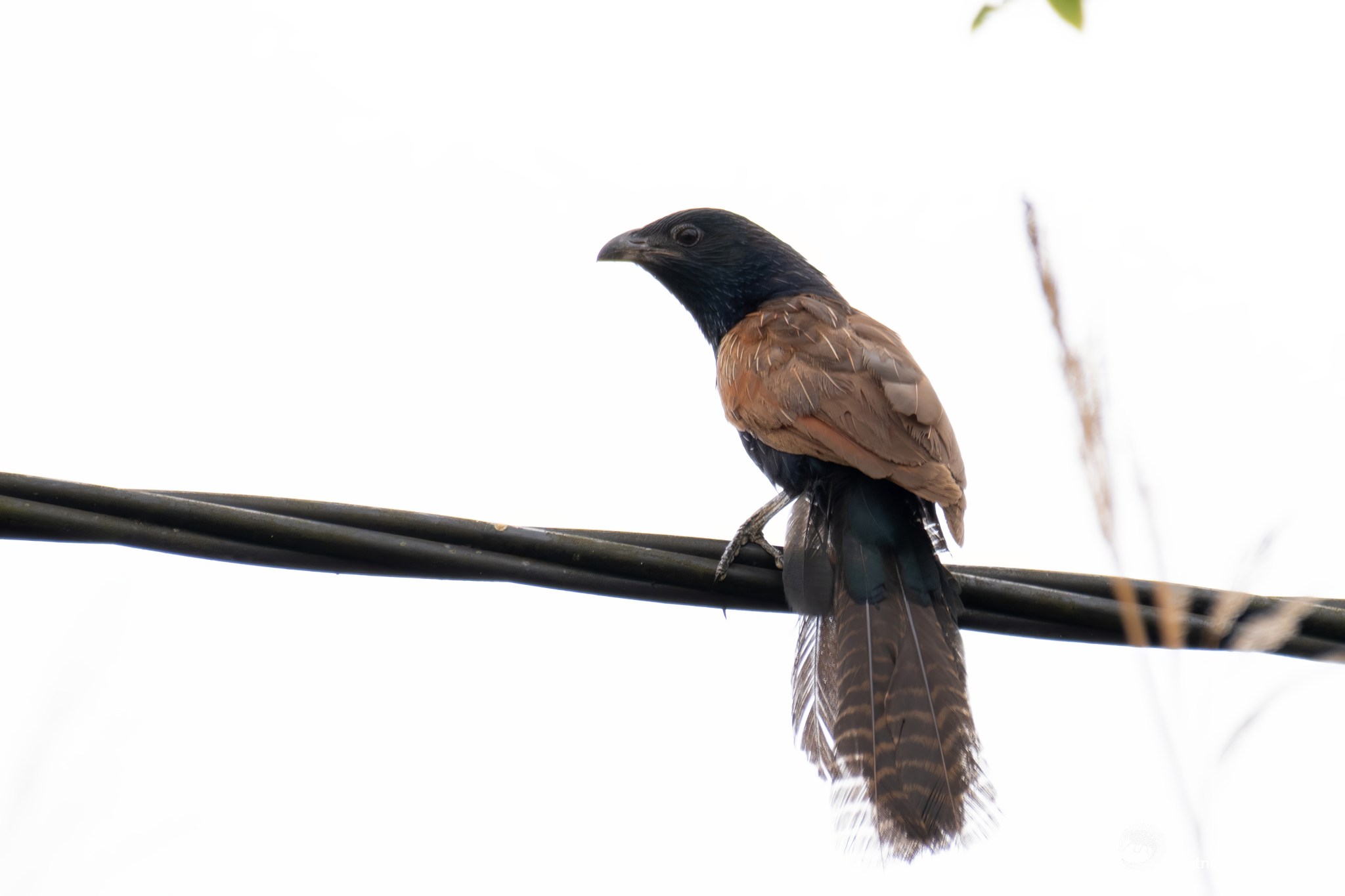 Lesser coucal is small sized species in coucal group (about 38 cm). In breeding season, it has a distinctive whitish streaks on the glossy blue-black head and underparts, contrasting