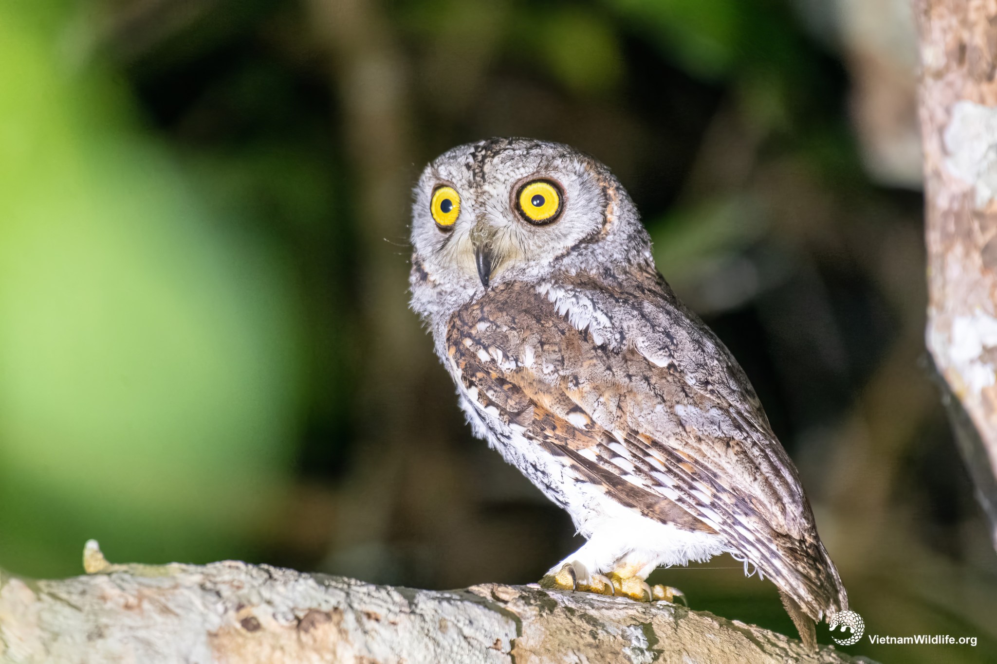 Oriental scops owl is one of the smallest scops owl (about 20 cm). It has big yellow eyes with white and narrow eyebrows, greyish plumage (paler underparts). Male and female are similar.