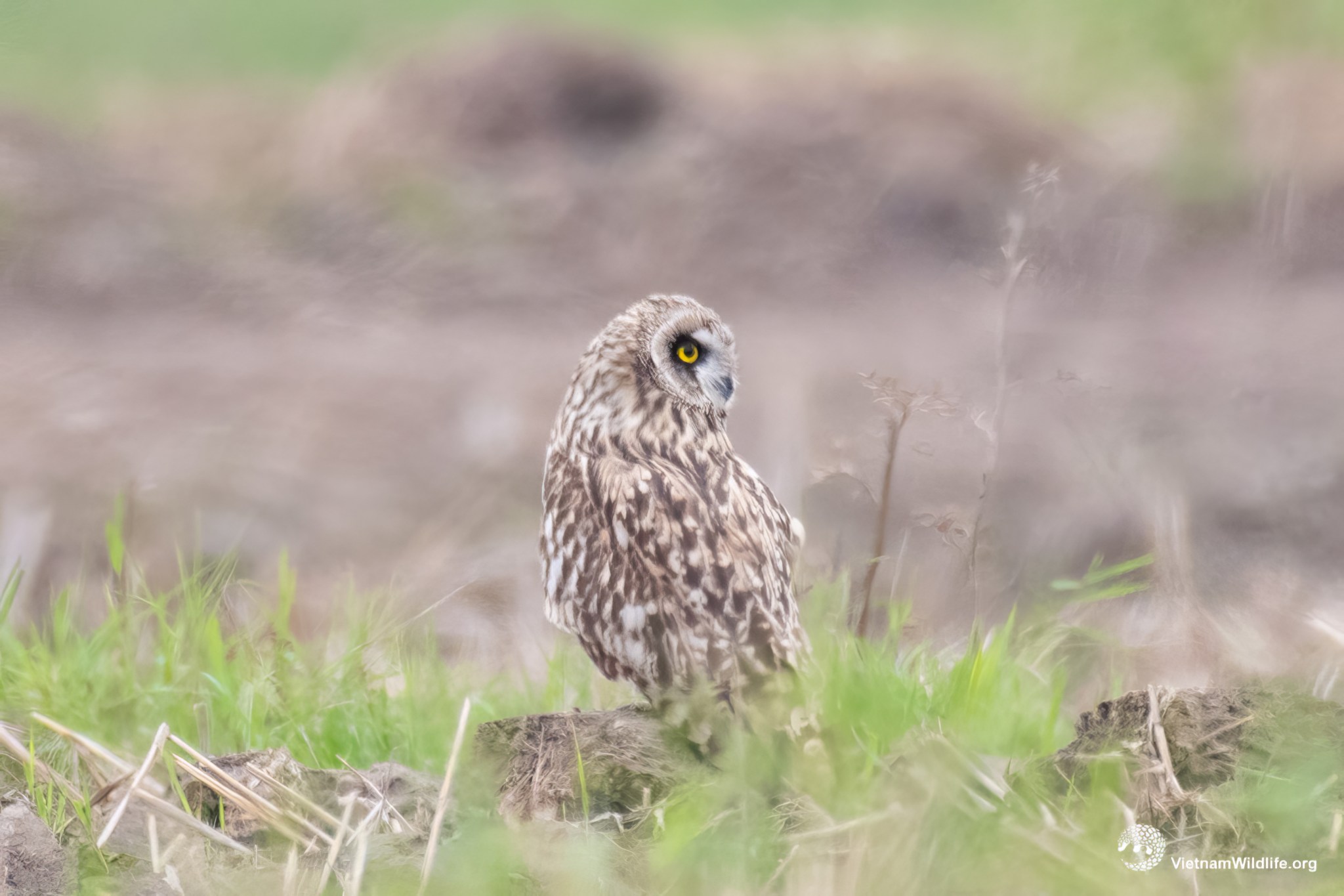 Short-eared owl is a medium species in the owl group (about 38 cm). It has a distinctive facial discs form rough circle, yellow eyes, broadly dark-barred upper-side and mostly whitish underwing with contrasting black bar along tips of primary covert. Female has distinctly deeper buff plumage.