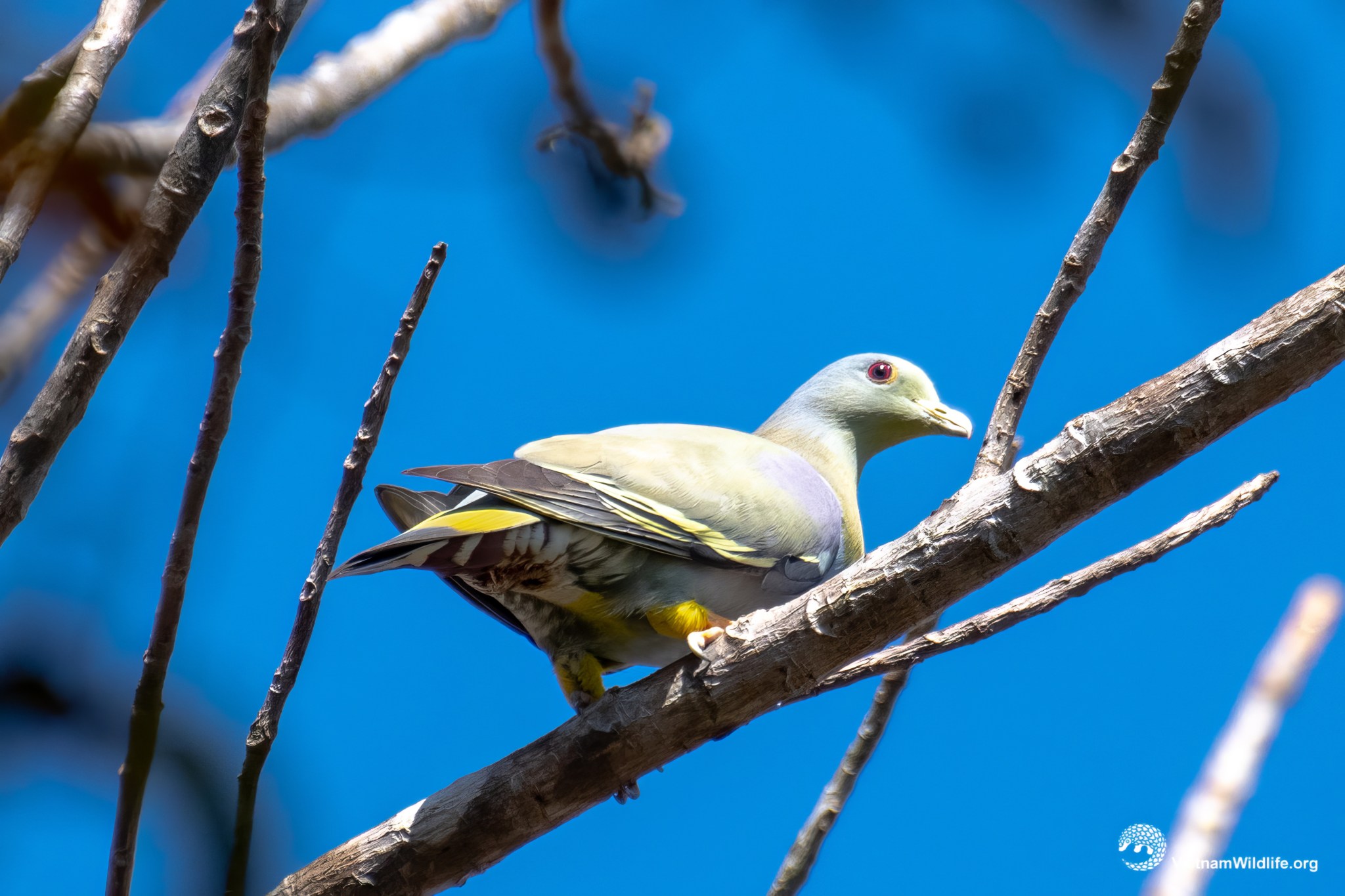 Yellow-footed green-pigeon is a medium sized species in the green-pigeon group (about 33 cm). It has a very colorful plumage with pale green throat, yellowish-green neck and upper breast, pale grey-green upperparts, grey lower breast and belly and yellow legs and feet. The male has a small pinkish-maroon shoulder-patch while the female does not.