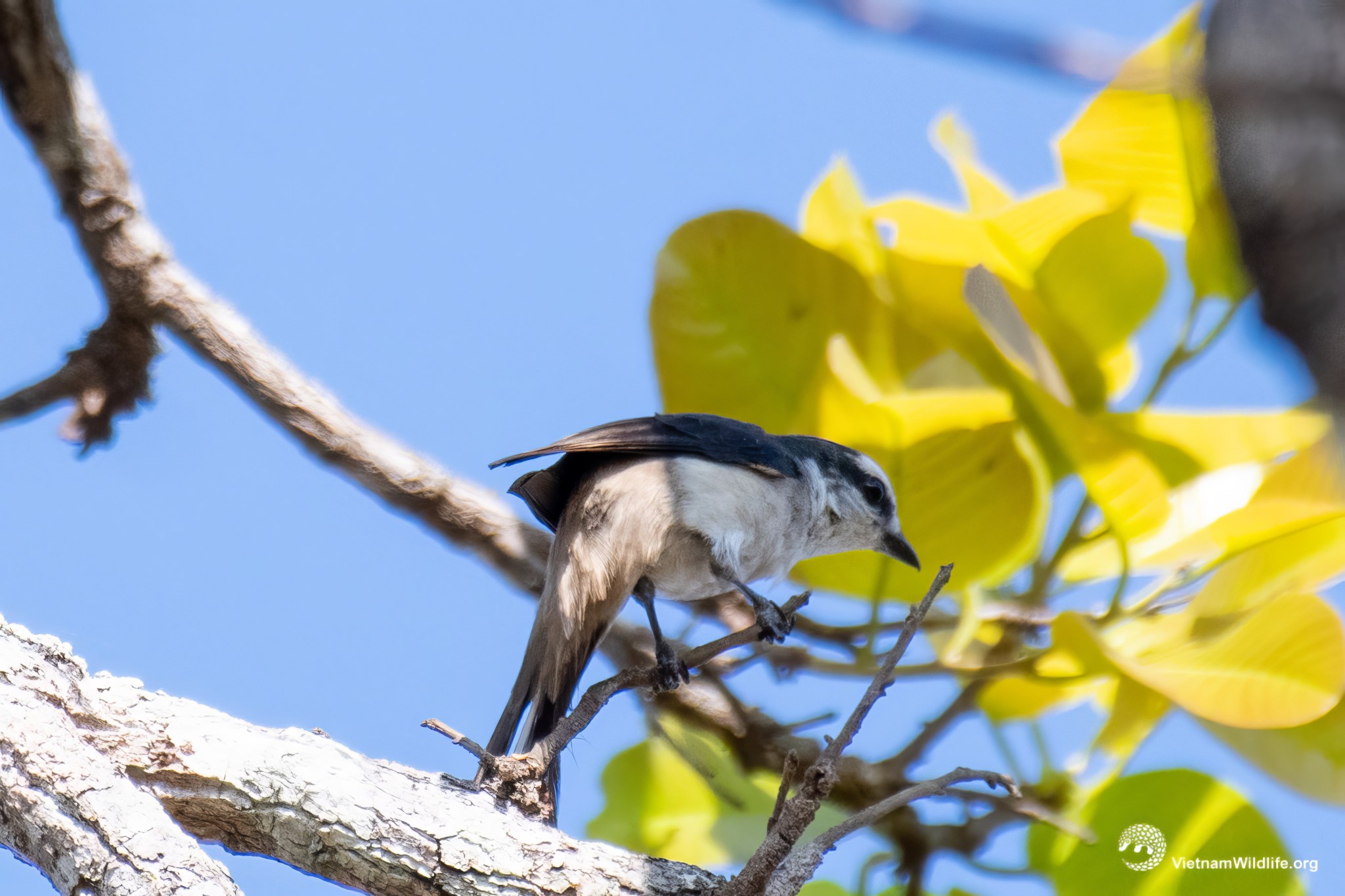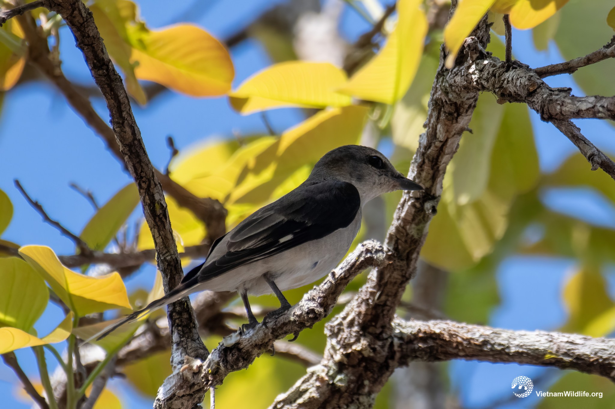 Ashy minivet is a large sized species in the minivet group (about 20 cm). The male has a a black eye-strips contracting to white forecrown and underparts diagnostic, black crown to nape and greyish upperparts. Female has pale grey crown and upperparts, a little whitish band across forehead to eye, and grey-whitish underparts.