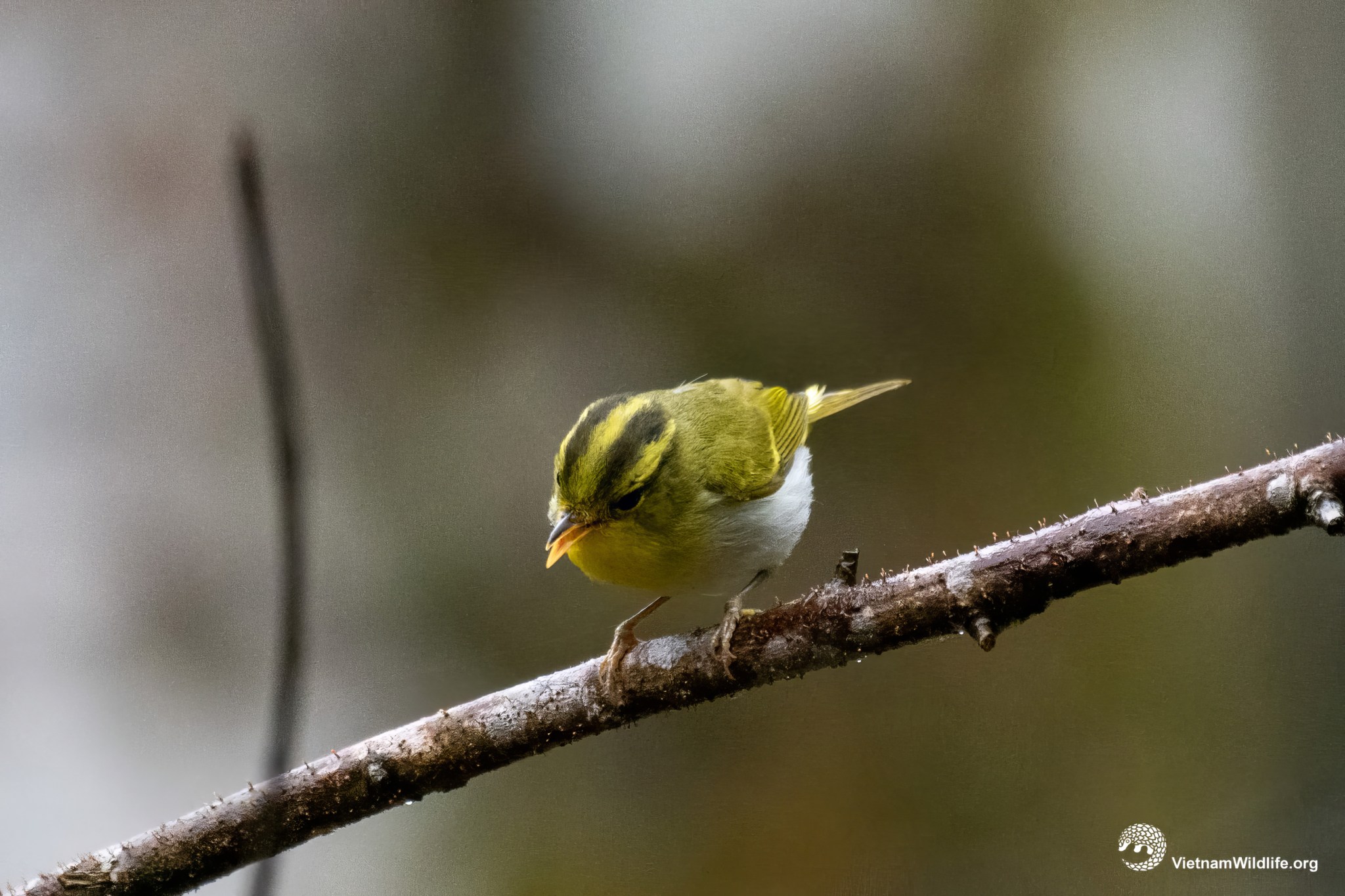 Yellow-vented warbler is a medium sized species in the warbler group (around 11 cm). It has unmistakable black lateral crown stripes, bright yellow head, upper breast, greyish-green upperparts and whitish underparts. Male and female are similar.