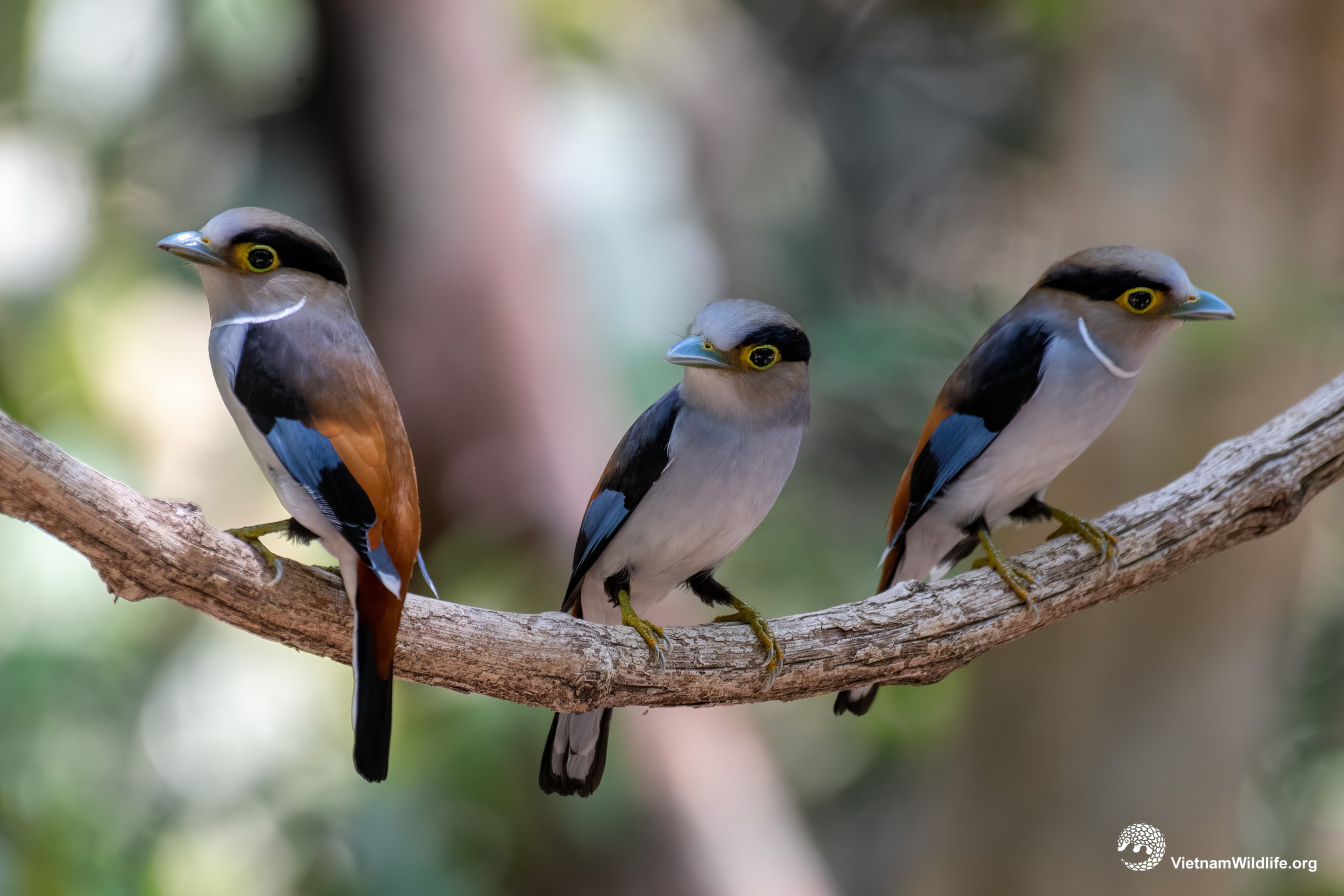 Silver breasted broadbill is the smallest species among five broadbill species in Vietnam (about 16 cm). Male has pale rusty head with ash-grey forehead and broad black supercilium, white underparts (including breast, belly and vent), bright rufous back and rump and striking blue and black flight feather. Female is similar to the male except has a a narrow silver band across the breast.