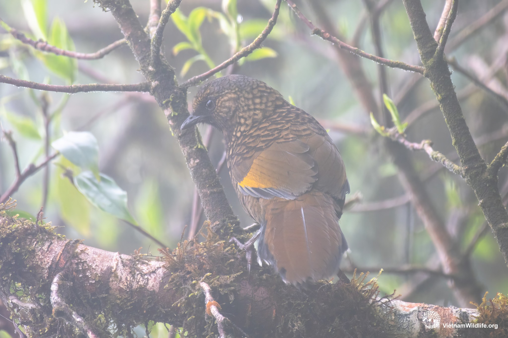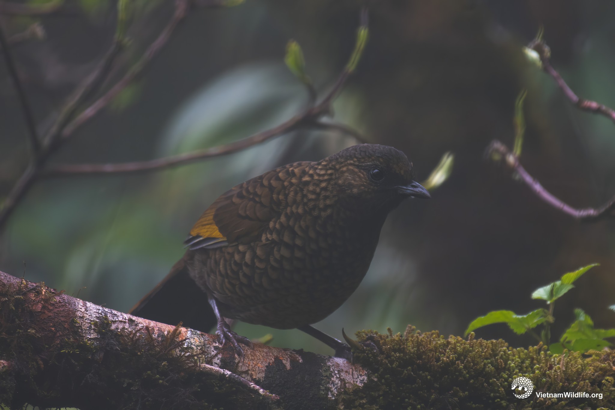 Scaly langhingthrush is a small sized species in langhighthrush group (about 22 cm). It has a dark grey head almost green with heavily dark-scaled plumage, and bright yellow patch in wing. Male and female are similar.