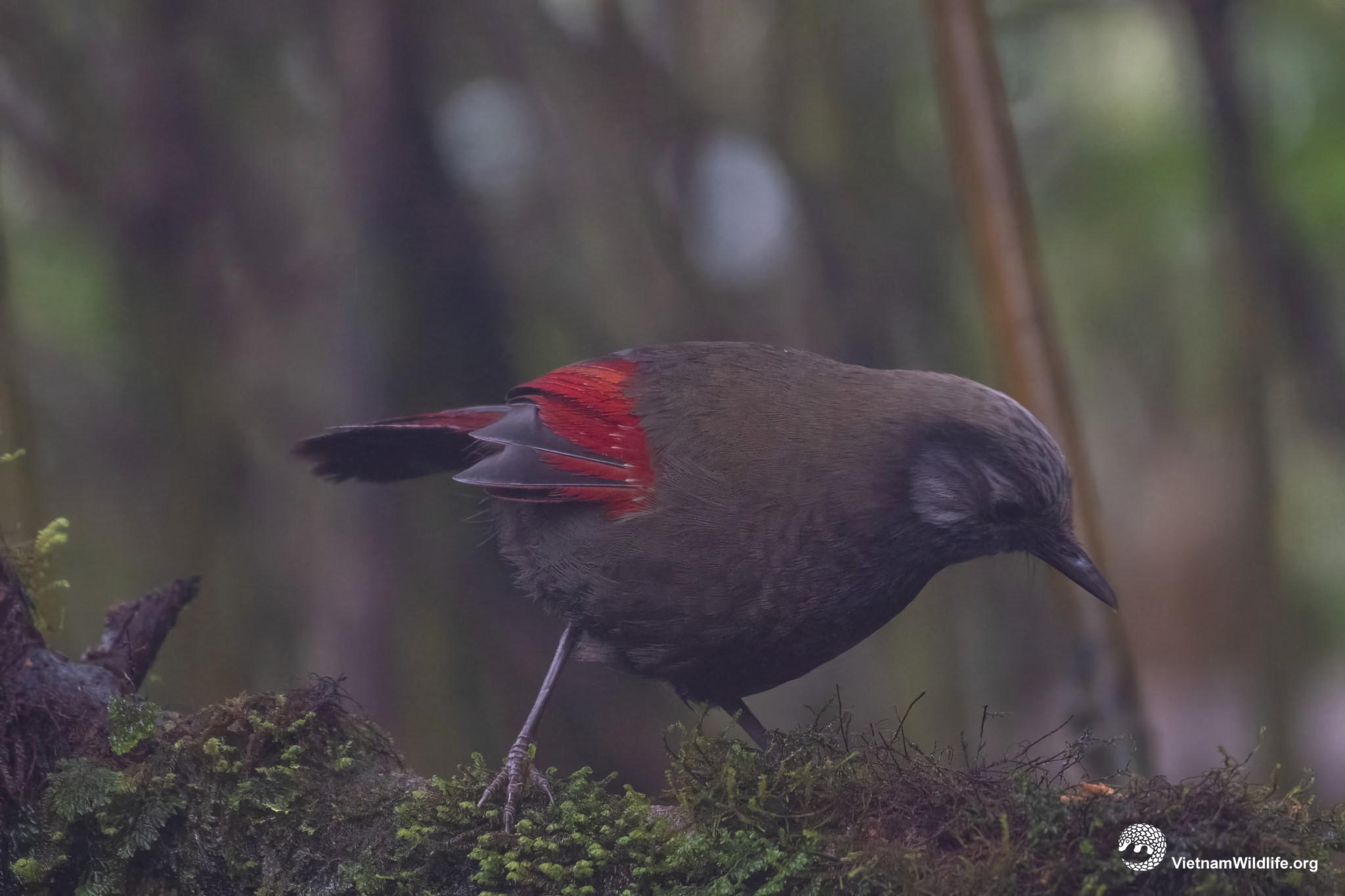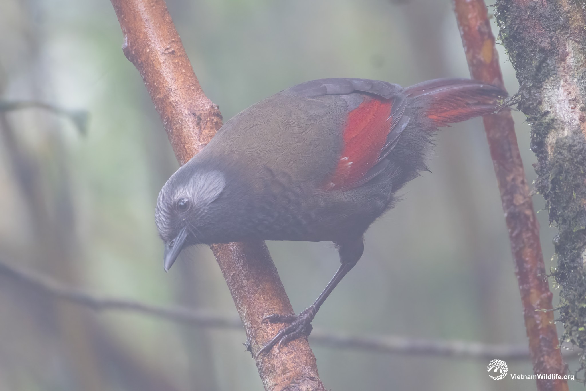 Red-winged laughingthrush is a medium sized species (about 27 cm). It has distinctive red wing and upper tail, silver-streaked grey forecrown and ear-coverts, plain brown upperparts, and browner underparts with heavy scaled-upper breast. Male and female are similar.
