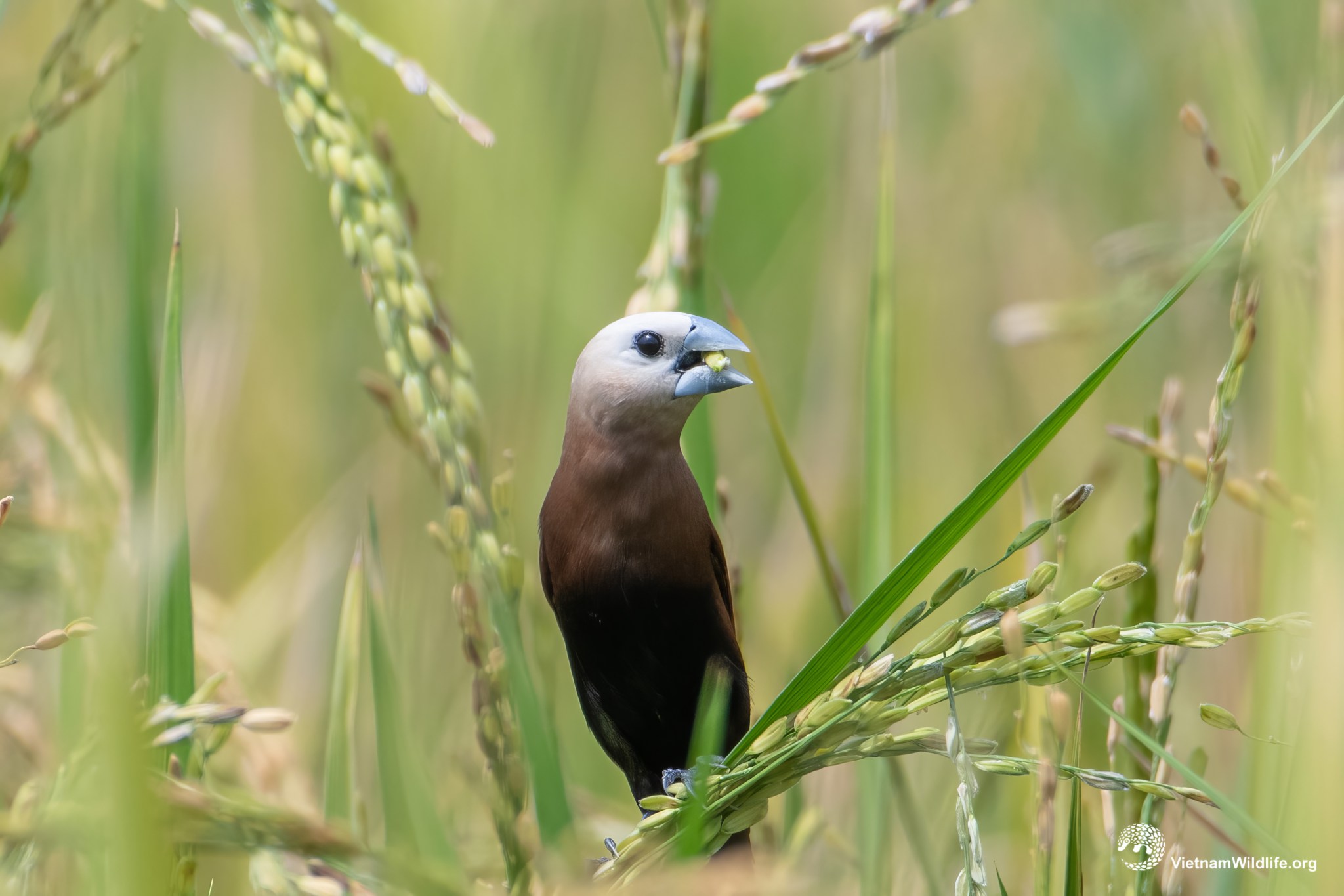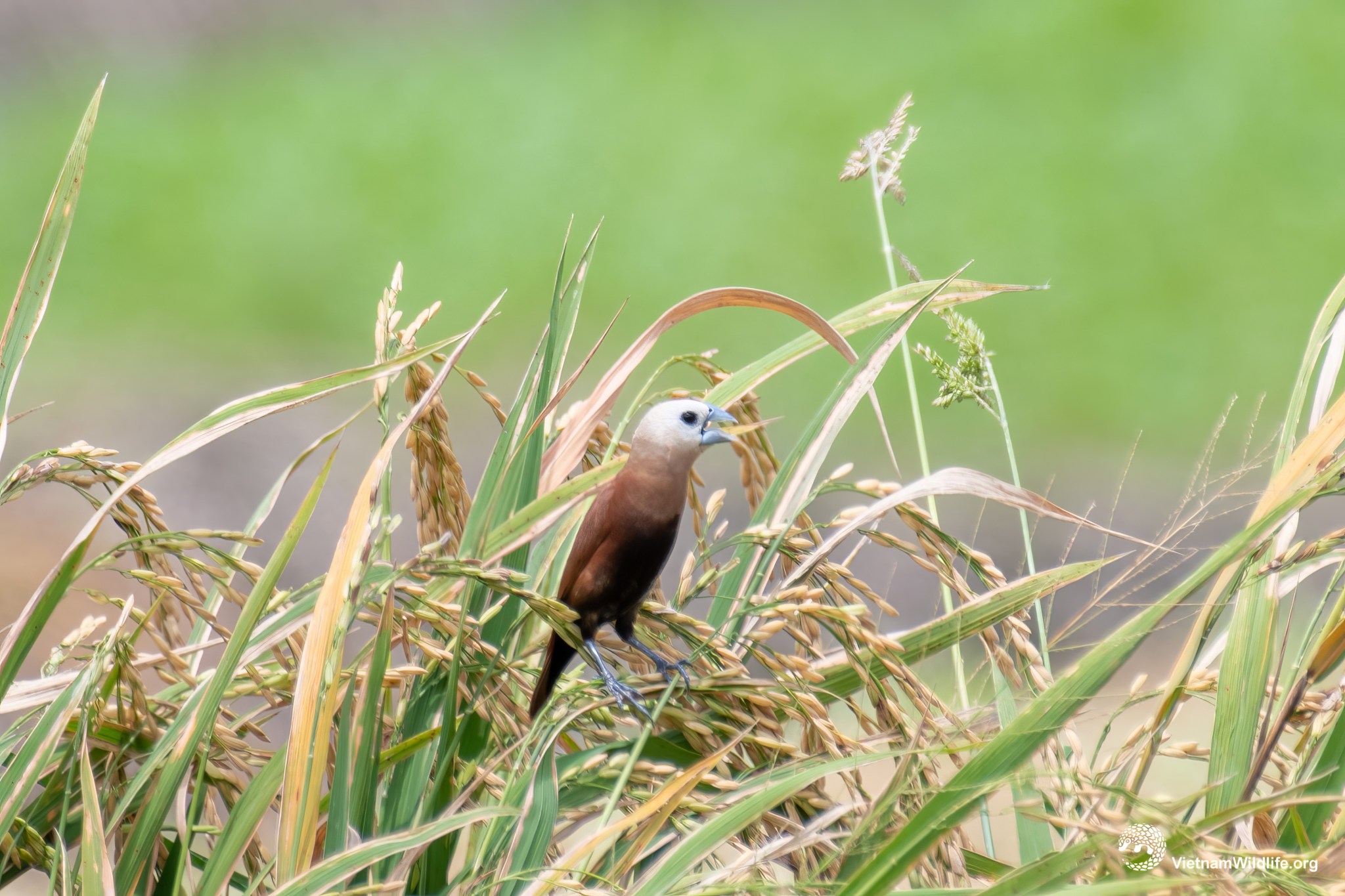 White-headed munia is a medium sized species in the munia group (about 11 cm). It has mostly white head and broad pale vinous-brownish plumage in other parts of it’s body.