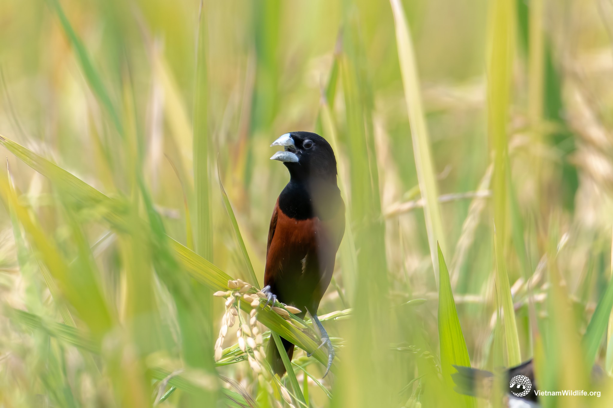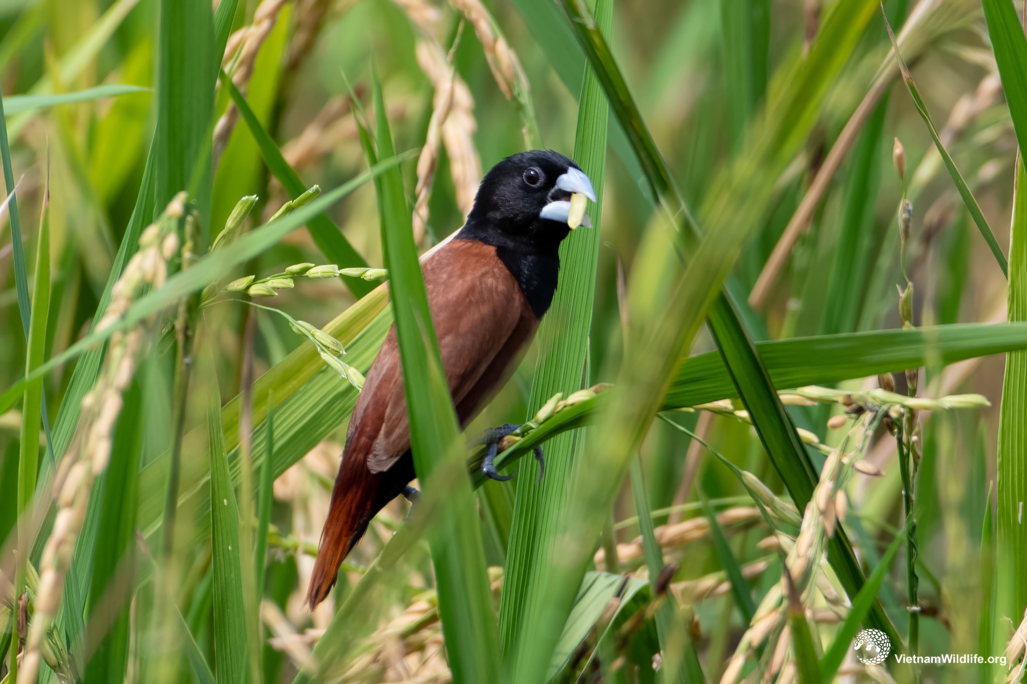 Chestnut munia is a medium sized species in the munia group (about 11 cm). It has a black hood contrasting with dark rufous-chestnut plumage and a bright blue bill. Male and female are similar.