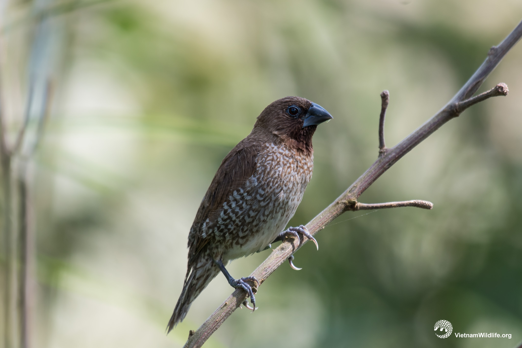 Scaly-breasted munia has brown upper-part, a dark conical bill, distinctive scale-like feather markings on underpart (from breast to flanks) and a brown tail.