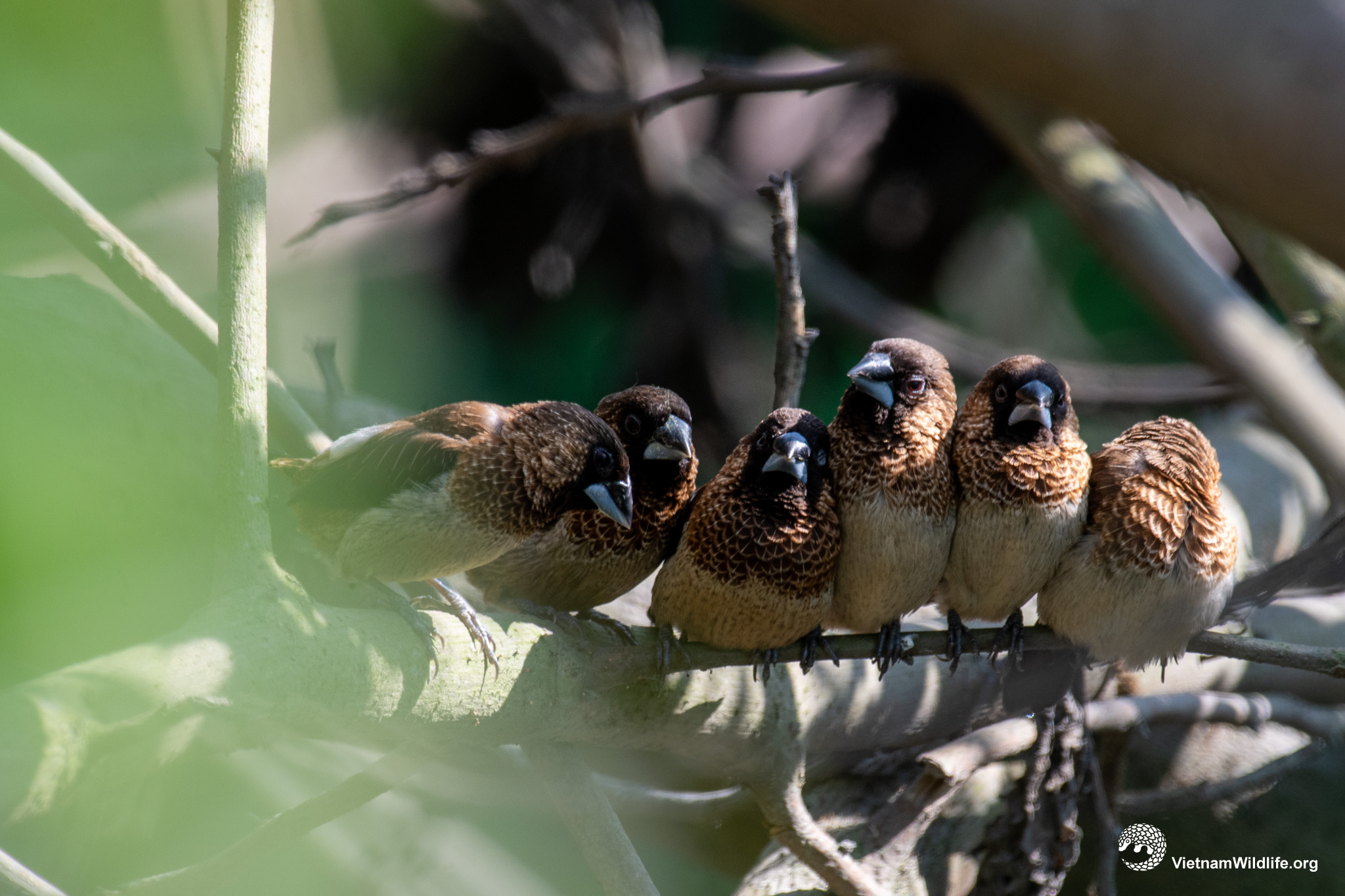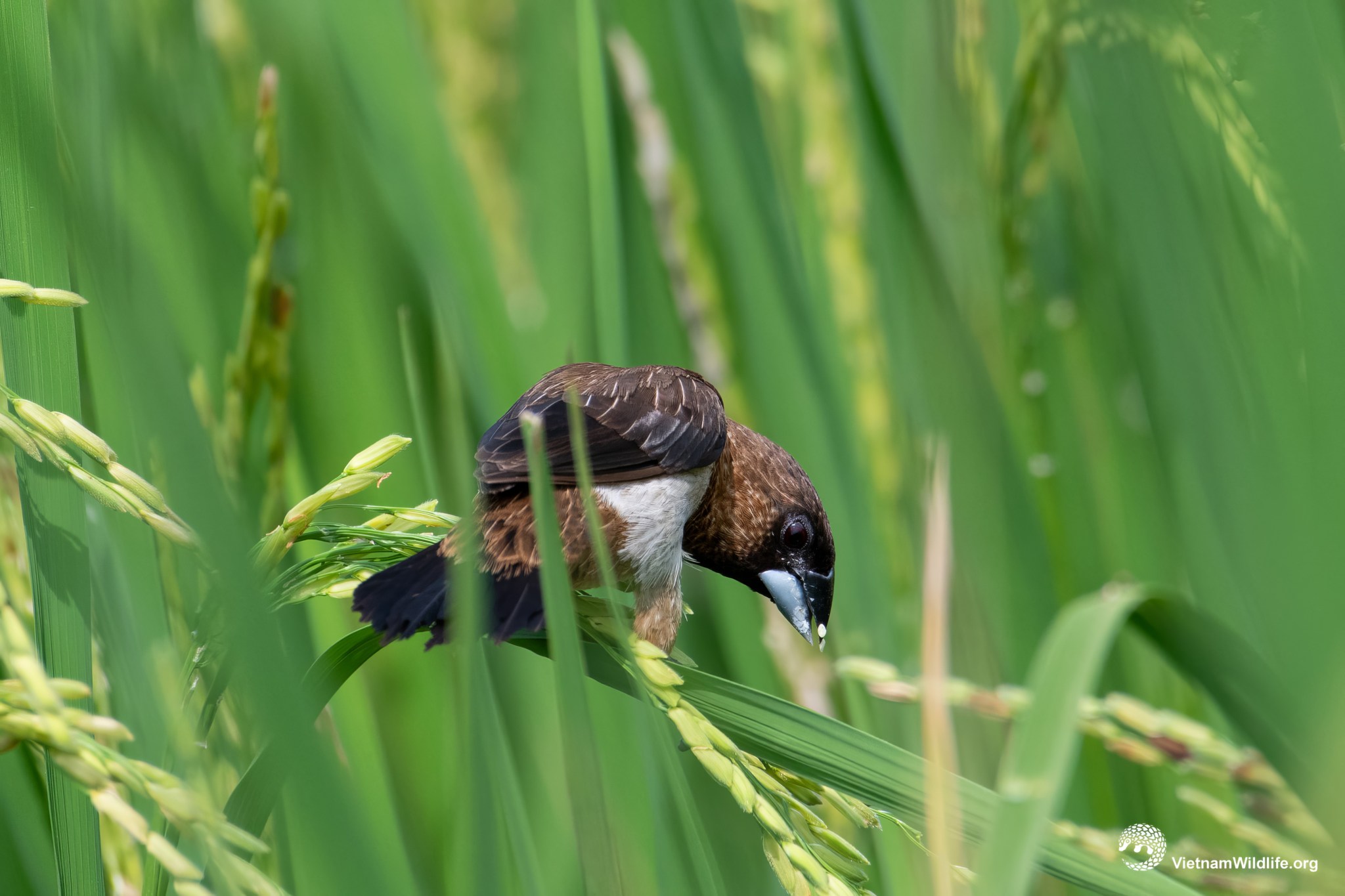 White-rumped munia is a medium sized species in the munia group (about 11 cm). It has a dark brownish upperparts with contrasting whitish rump, heavy white-scaled neck and pale gray underparts. Male and female are similar.